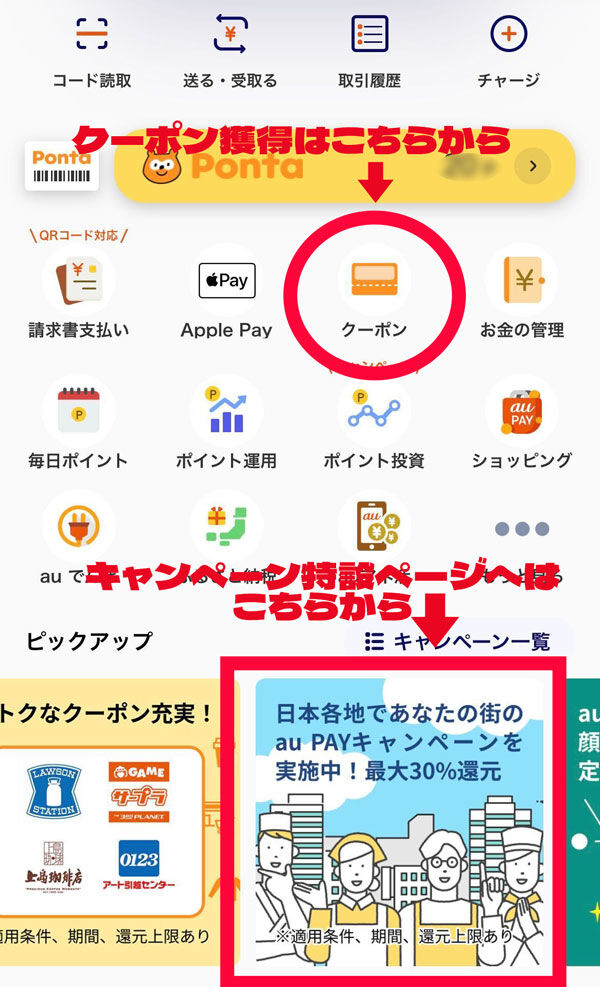クーポン設定〜お支払い方法・au PAY残高へのチャージ方法↓
