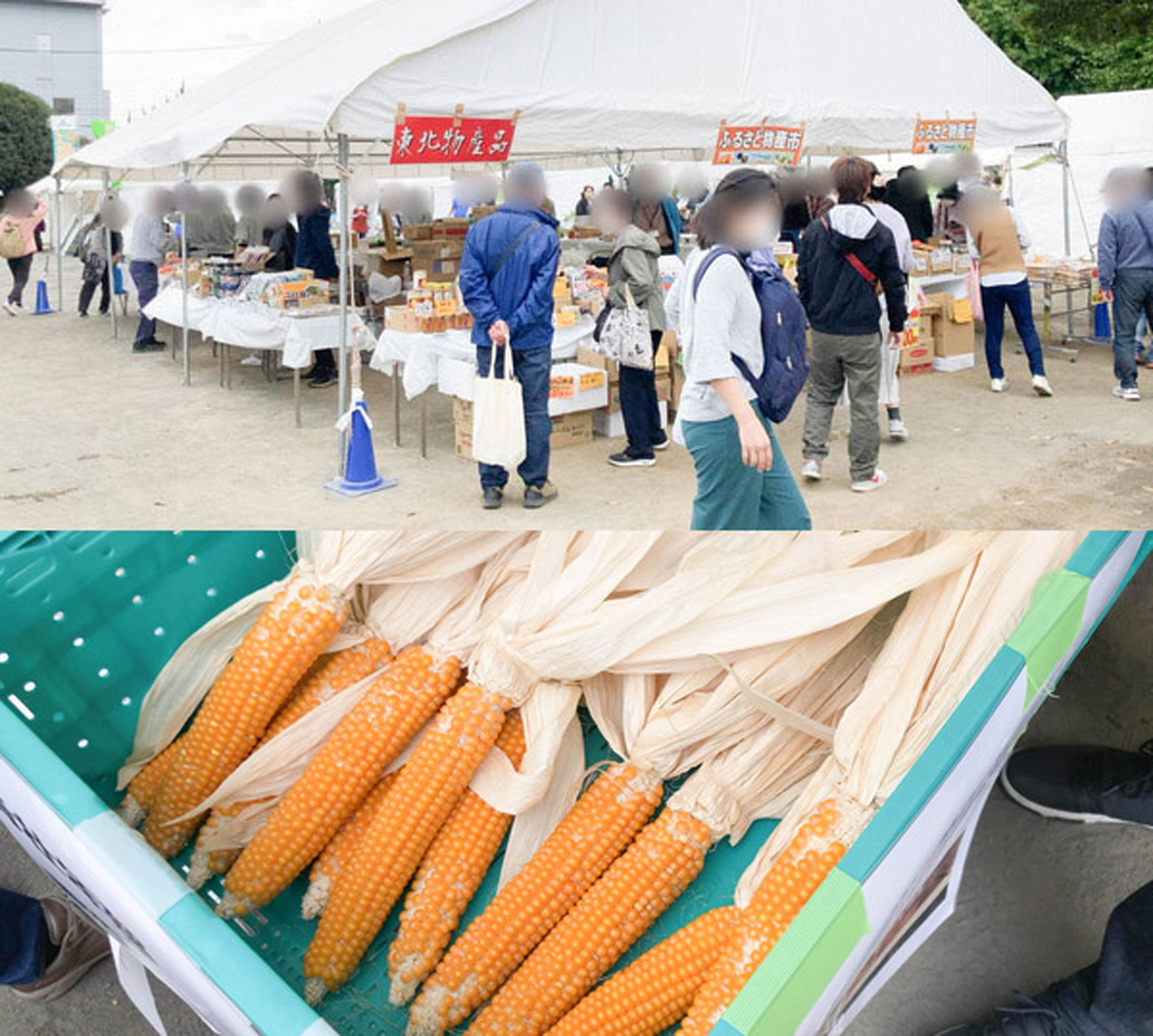 「品評会に出展した大和市産の野菜がずらり♪去年やまとぴでも買った毎年人気のポップコーンの原木もあるから、お家で子どもと一緒に作るのもいいよね!」