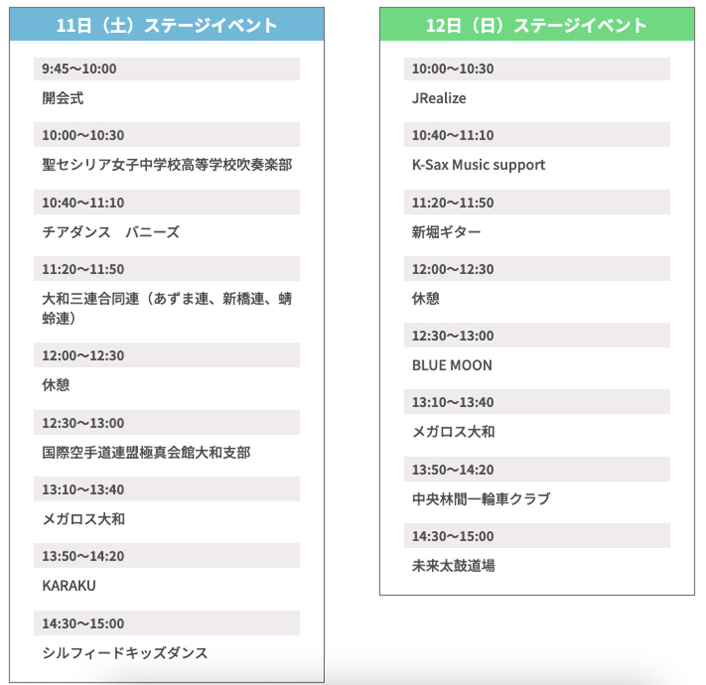「その他にもステージパフォーマンスや楽しいイベントが盛りだくさん!会場には飲食の出店もあるし、大和市産の野菜の販売を初めとした物販ブースもあって、大人から子どもまで楽しめるイベントになりそう、楽しみ〜♪」