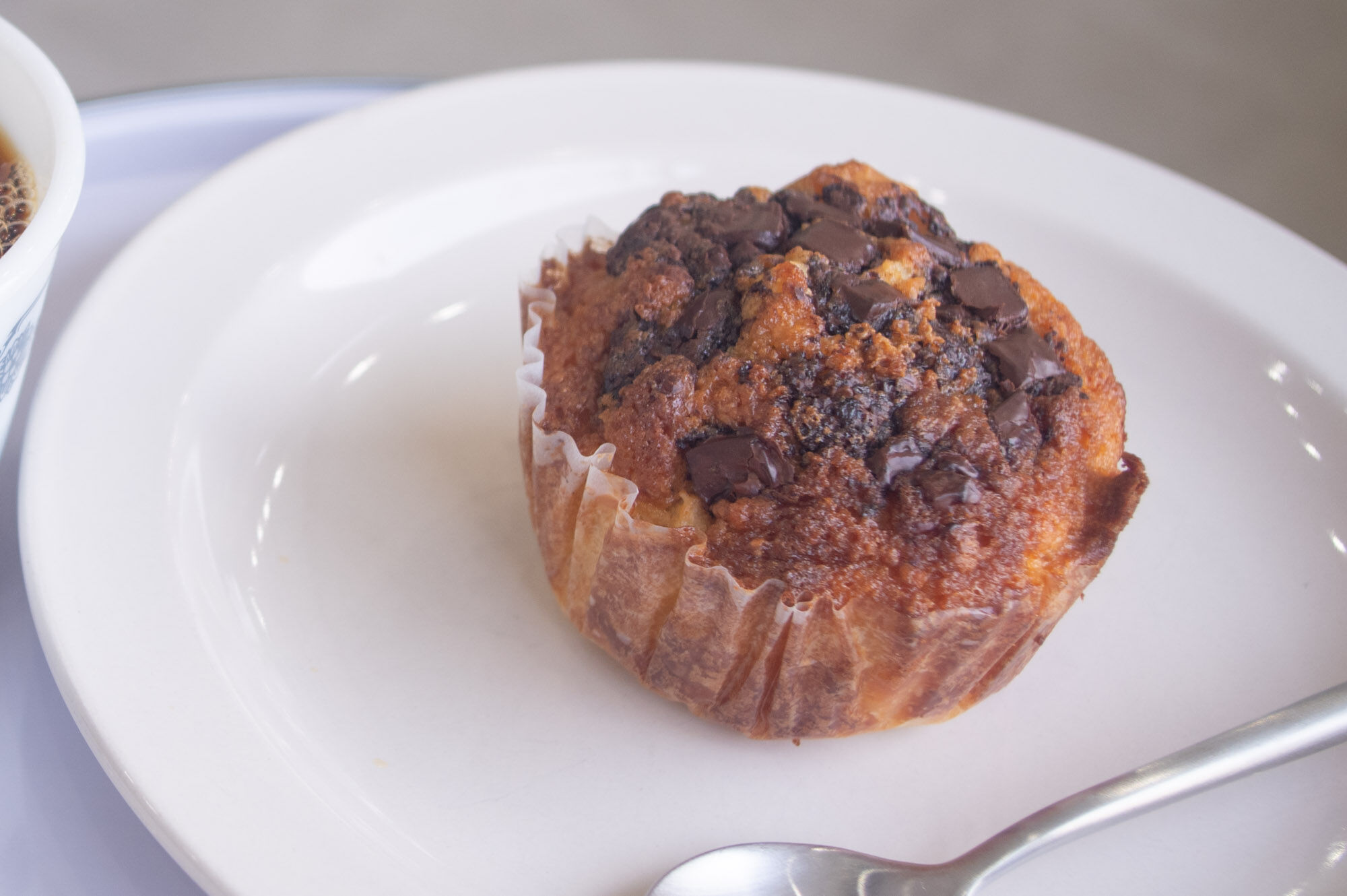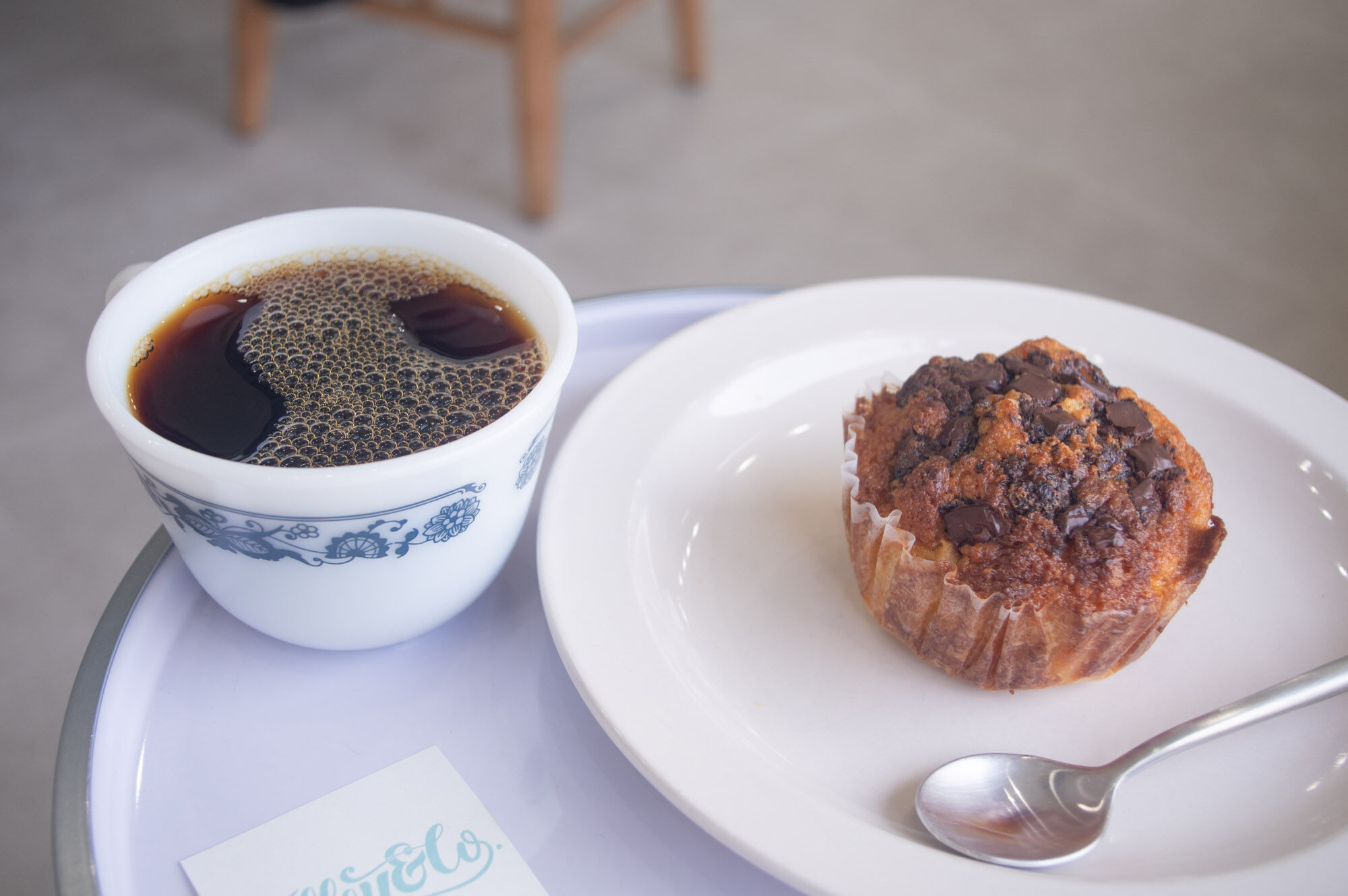 Dark Blendのコーヒー(600円)とマフィン チョコチップ(500円)。