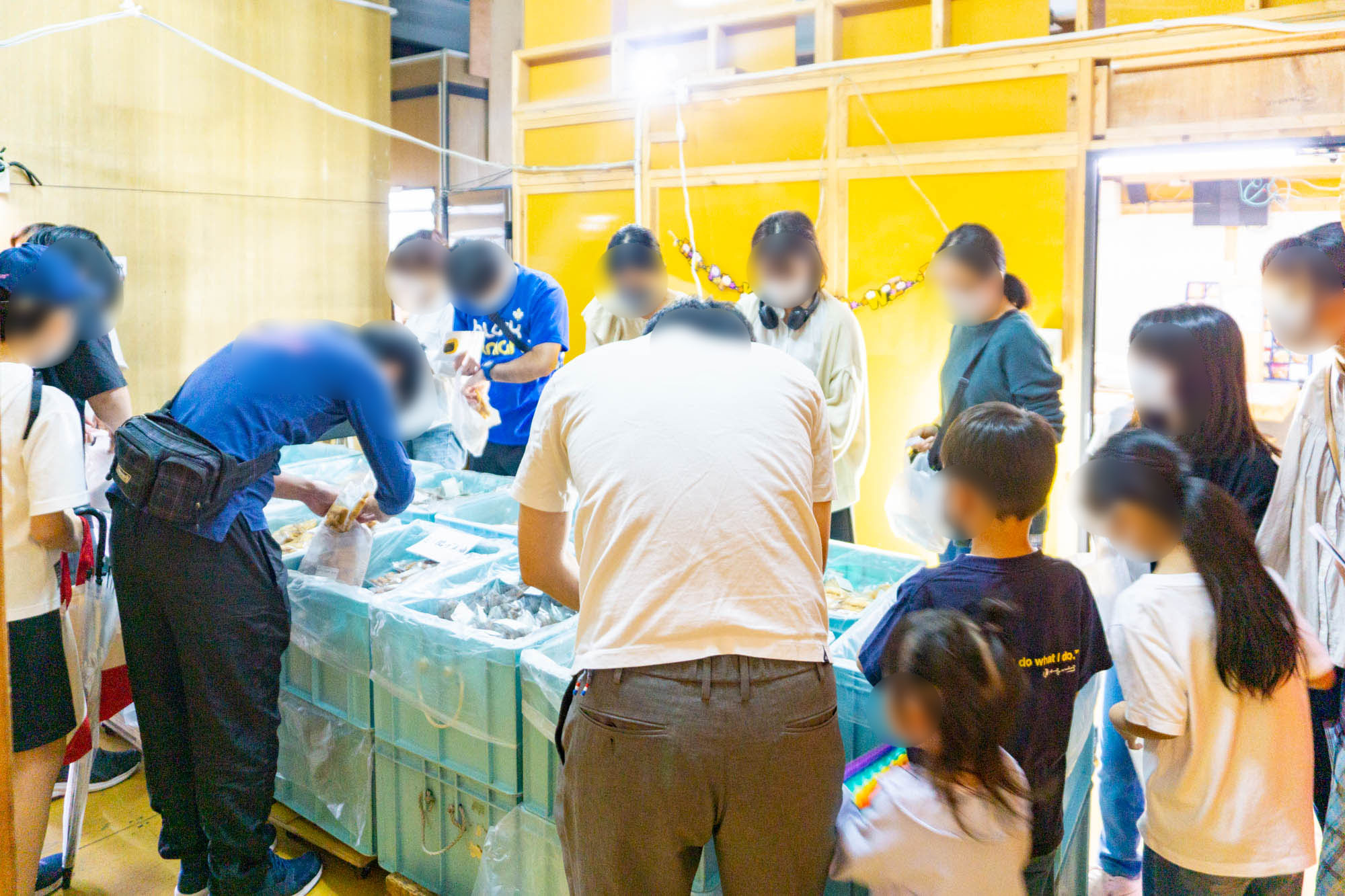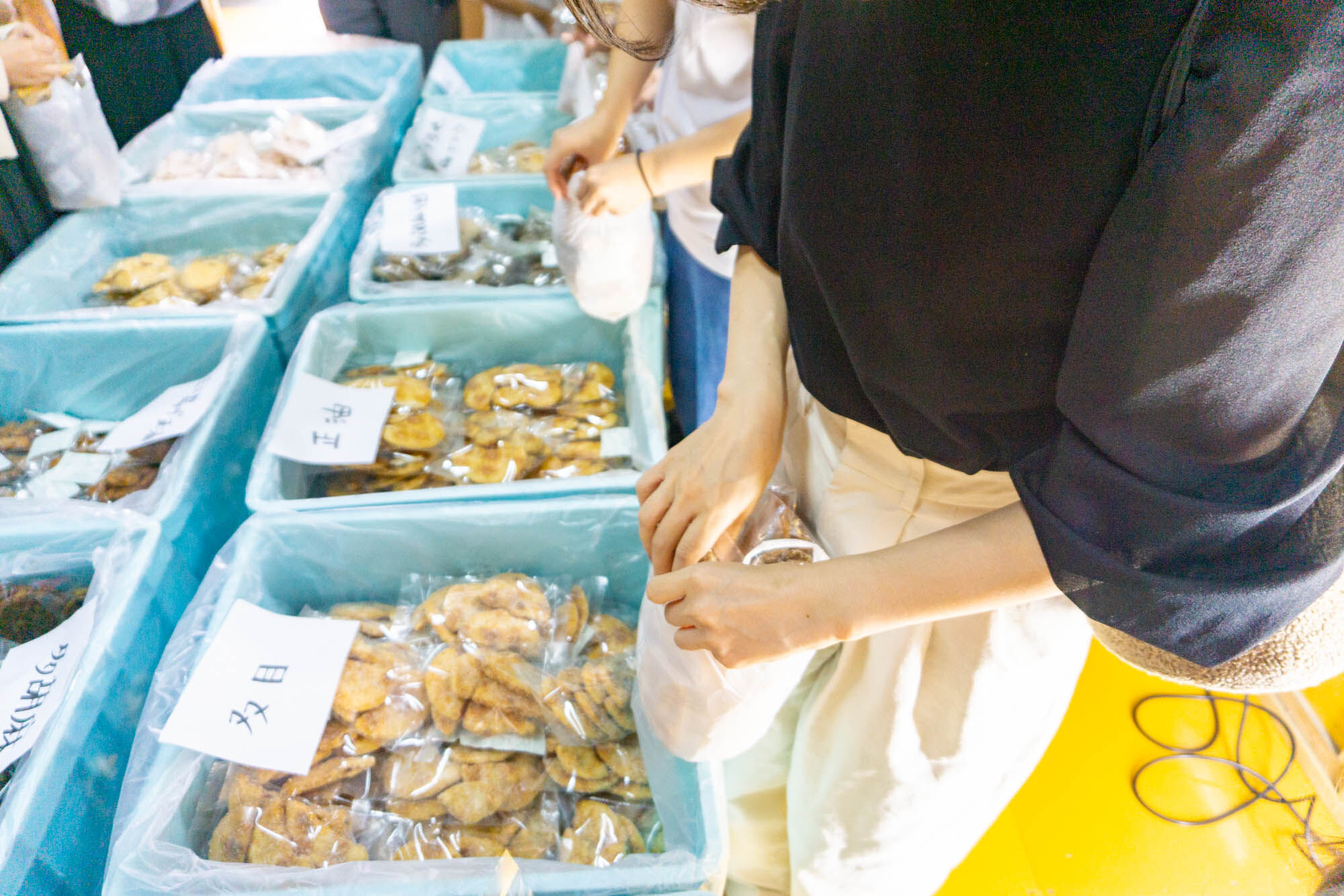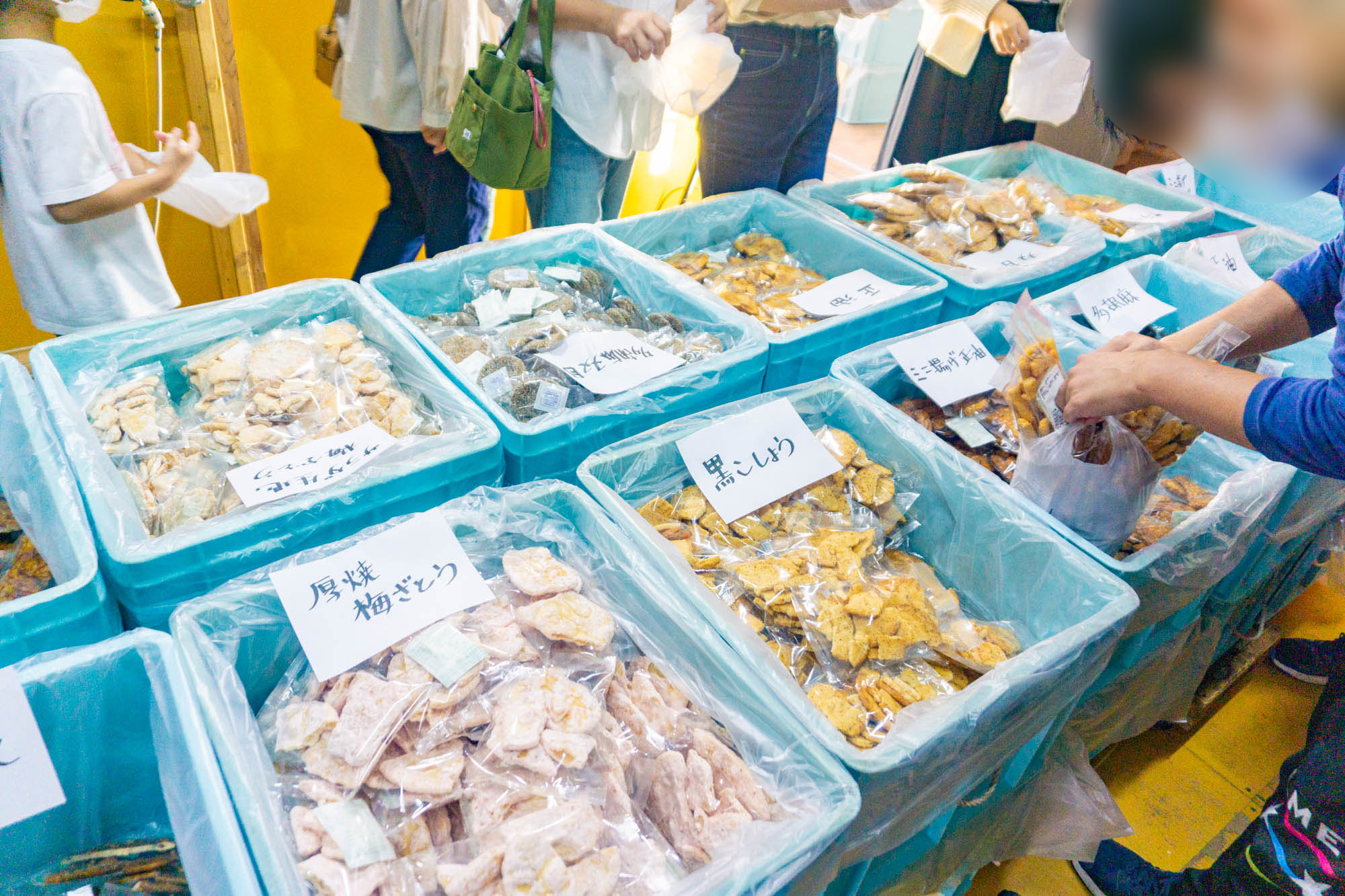 賑わっている〜!私達が来た時にはすでにたくさんの人が詰め放題を楽しんでいました。空いた場所に入り込んで好きなお煎餅を入れていきます!