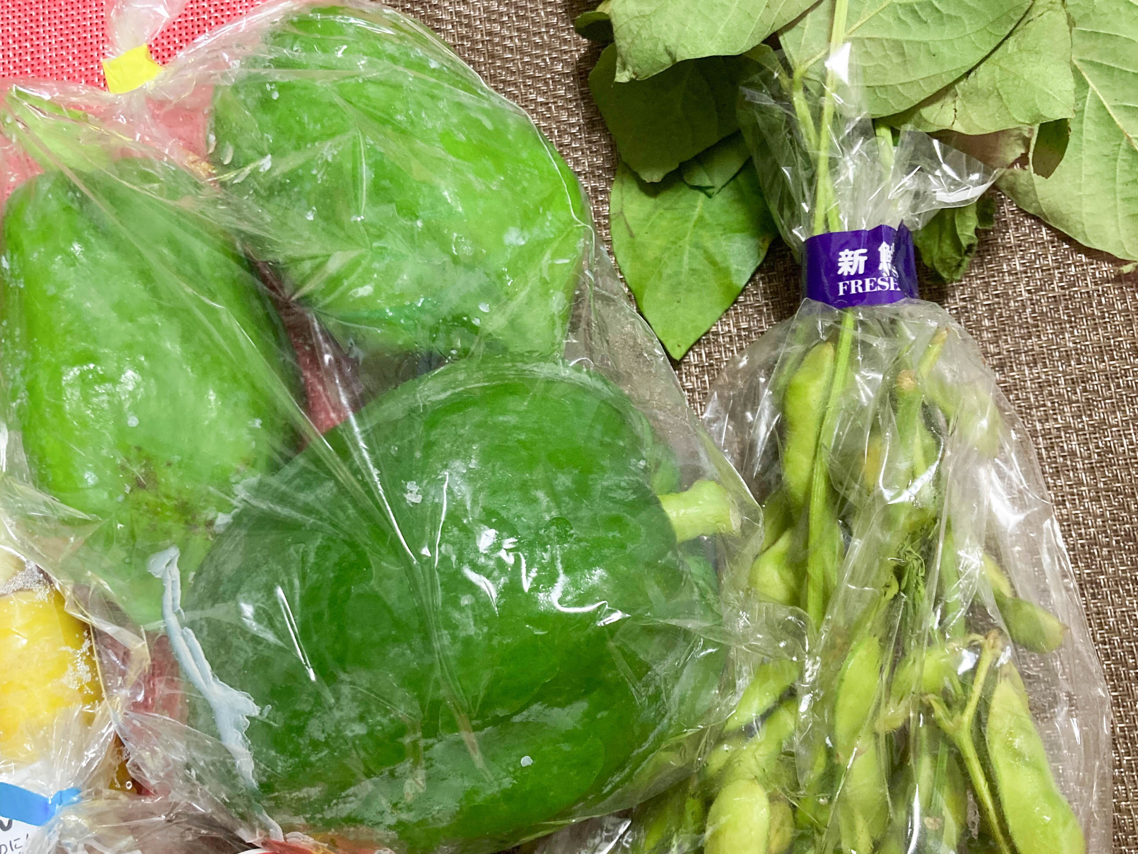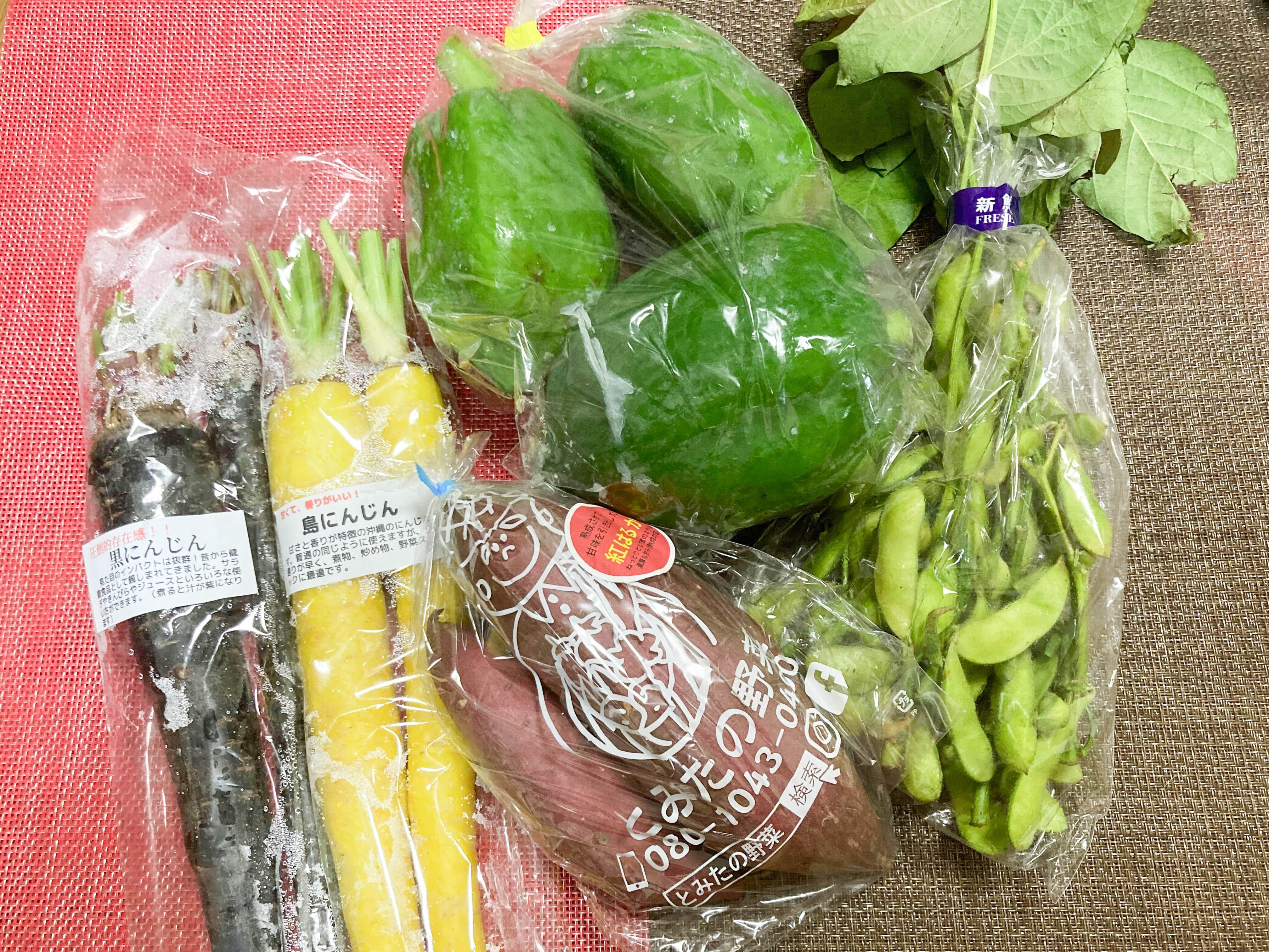 左から黒人参、島にんじん、さつまいも、枝豆。中央上の緑の野菜は以前紹介したこともある青パパイヤです。ちなみにすべて大和市産。