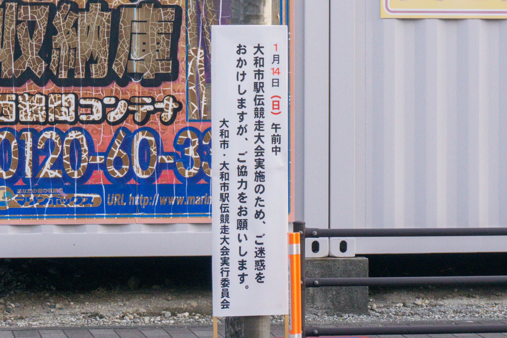 当日のコース付近には「大和市駅伝競走大会実施のため、ご迷惑をおかけしますが、ご協力をお願いします」との看板が設置されていました。