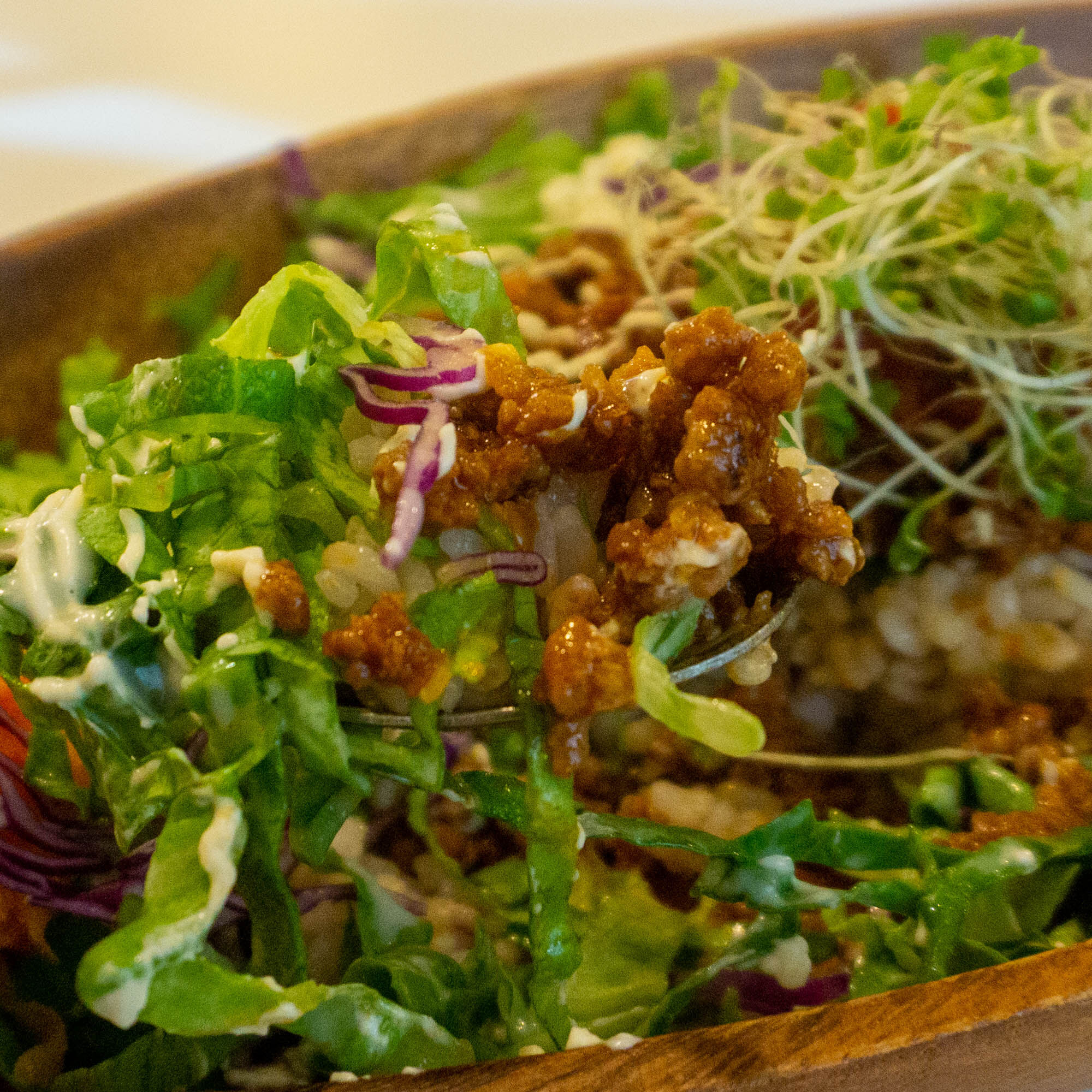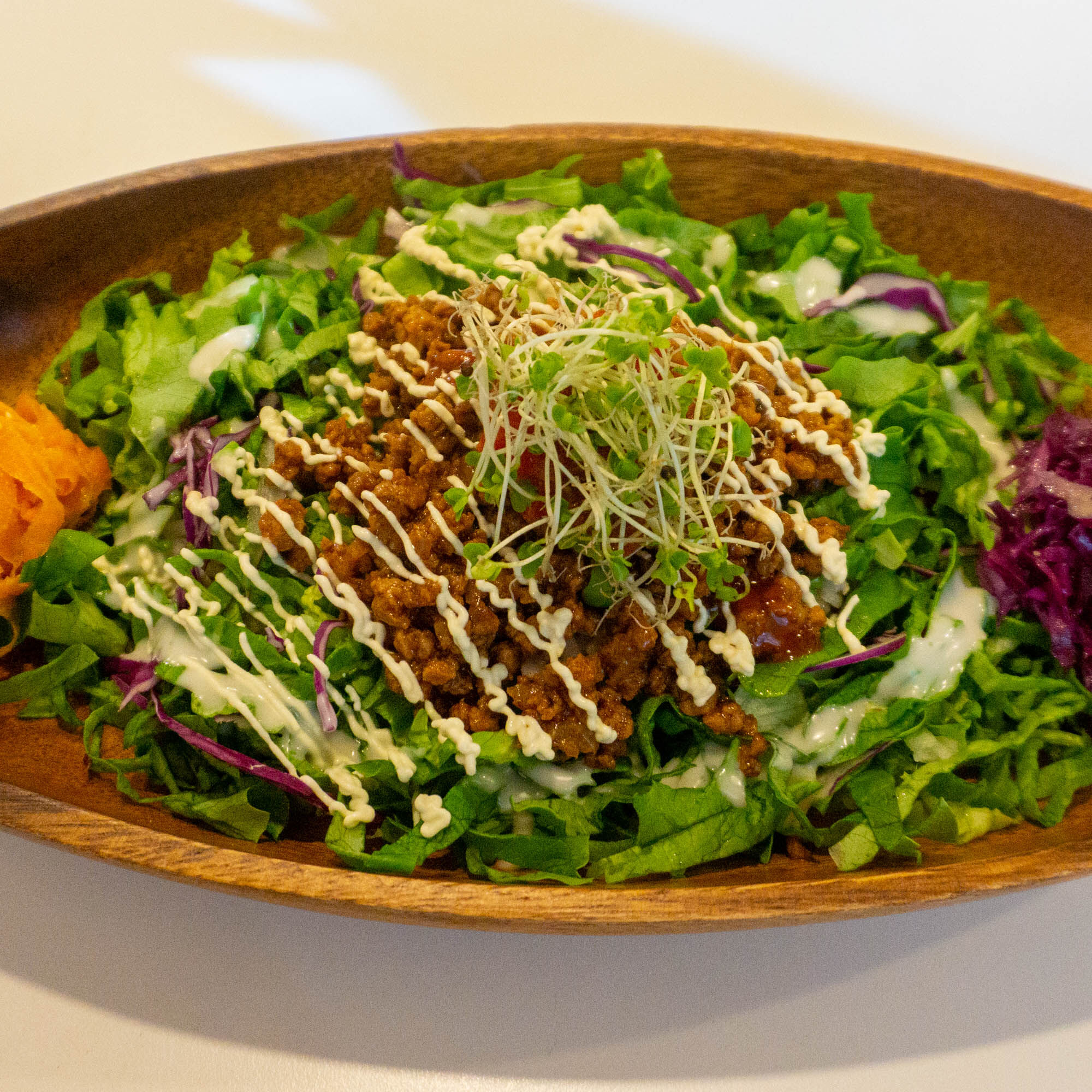 食べてみるととにかく野菜の新鮮さがおいしい!タコスソースとドレッシング、マヨネーズかなの3種類が混ざり合ってたっぷりの野菜もどんどん食べられます!ちなみにご飯は玄米。
