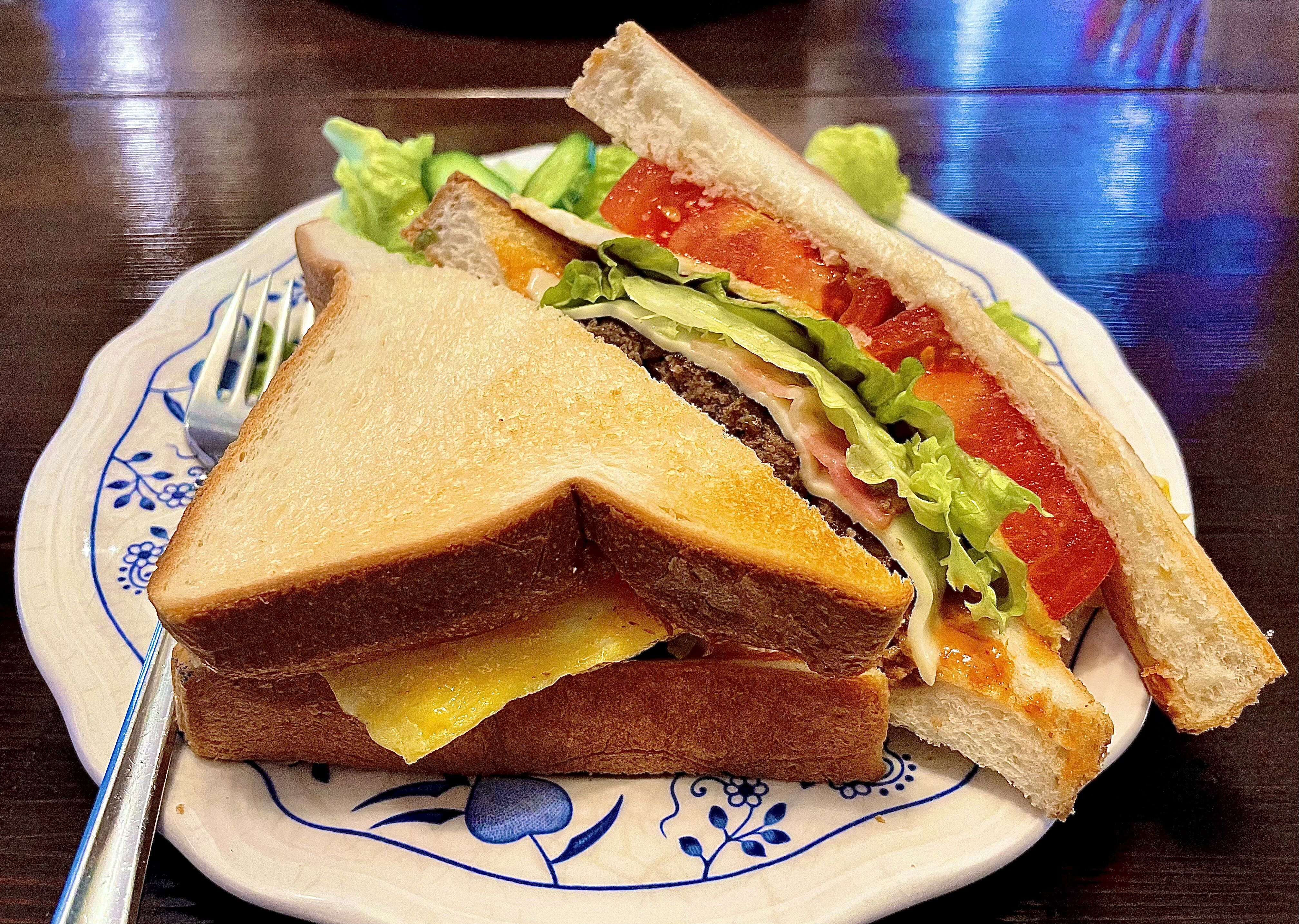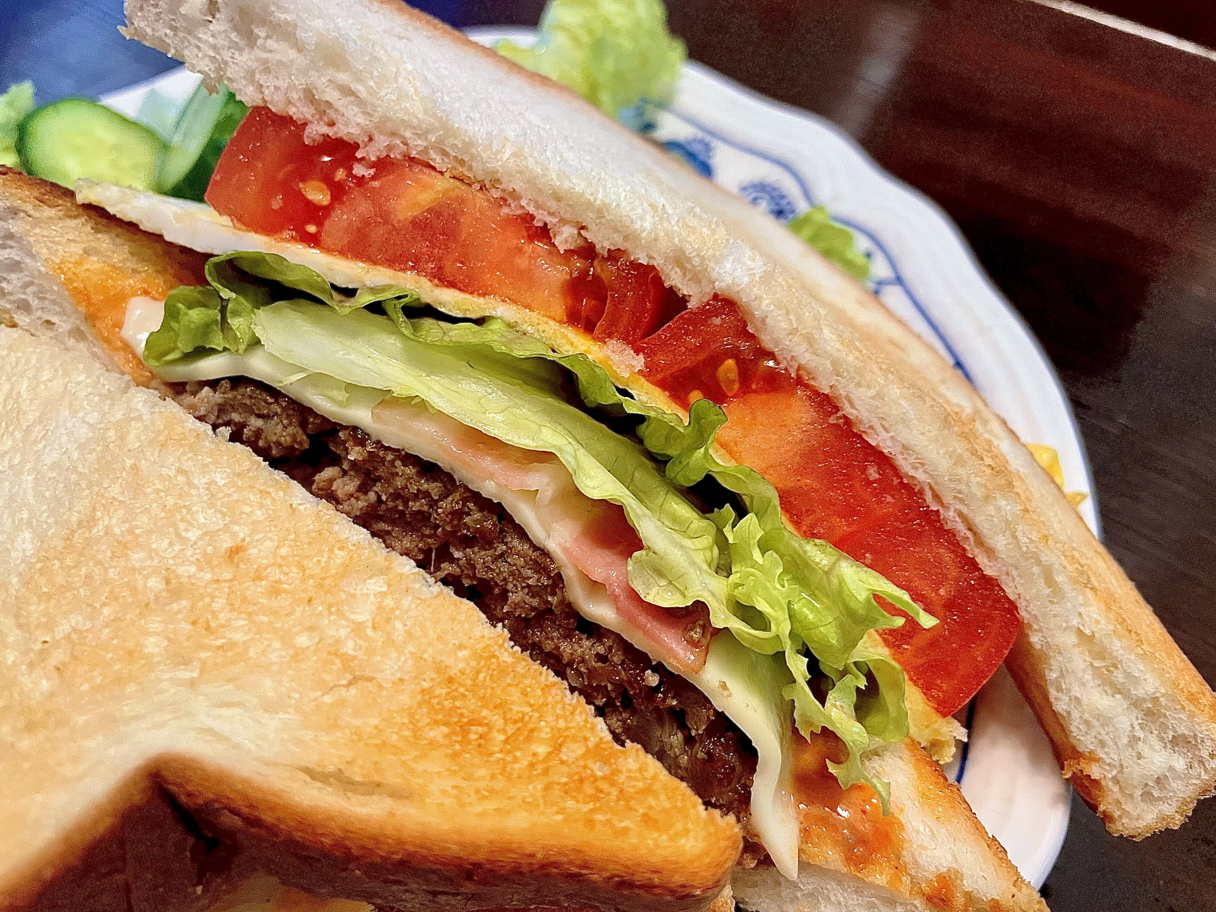 サックサクに焼かれた食パンに、手ごねハンバーグ、チーズ、ベーコン、卵焼き、