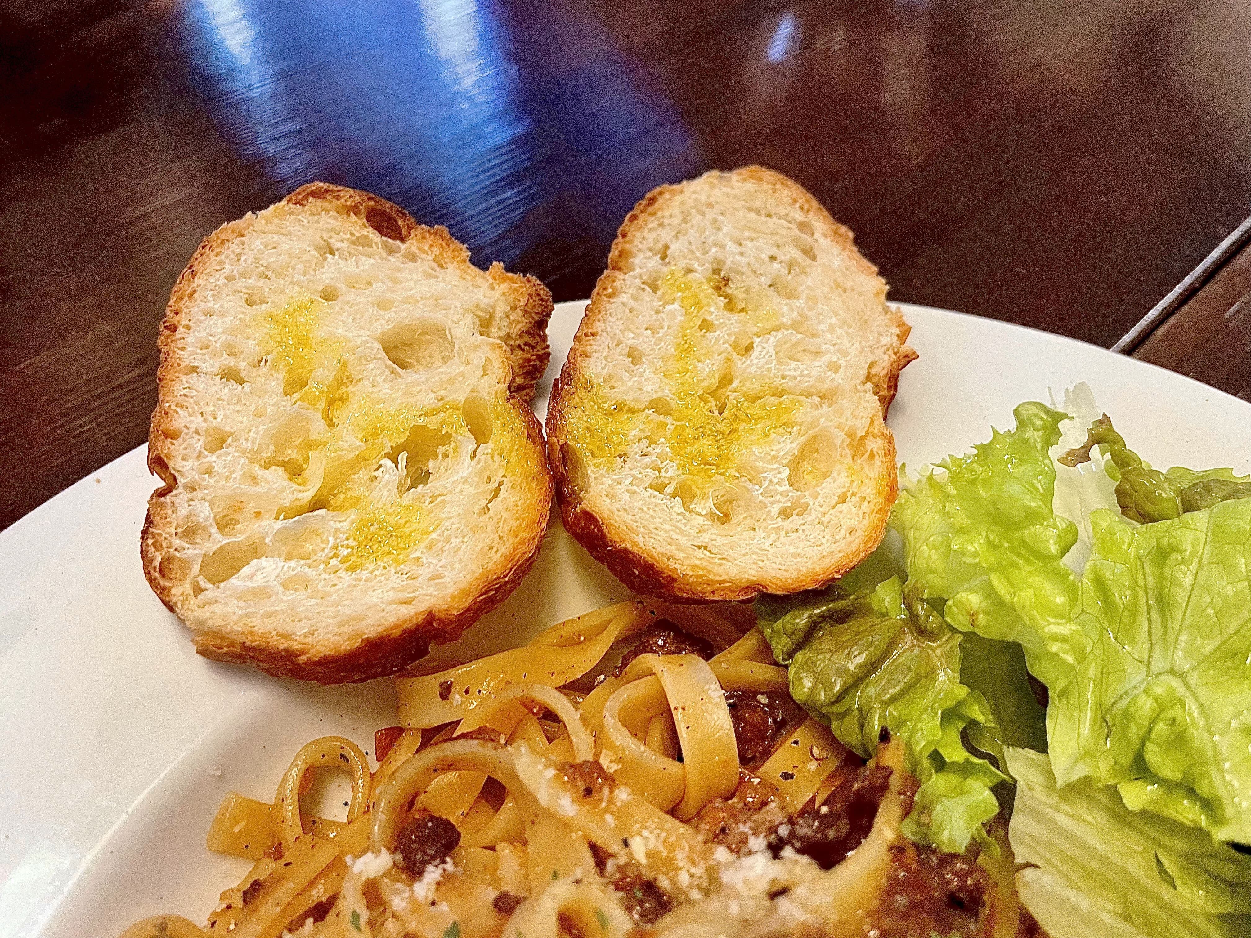 オリーブオイルがかけられたバケット2つと、グリーンサラダも一緒に盛られています。