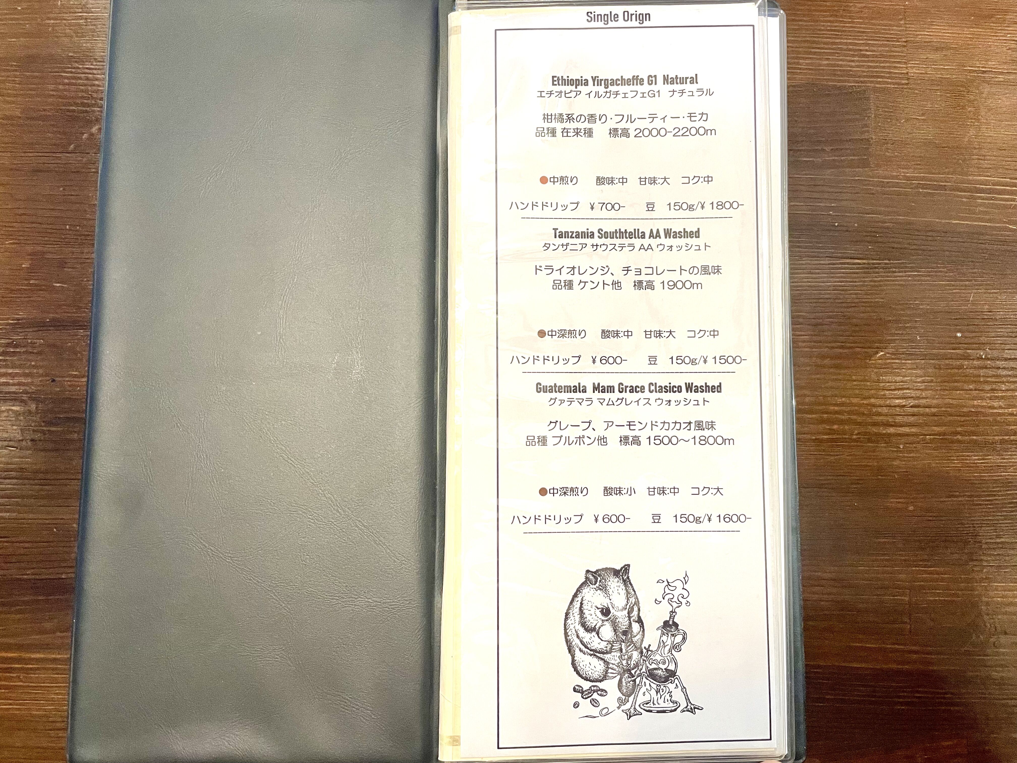 コーヒーのメニュー。