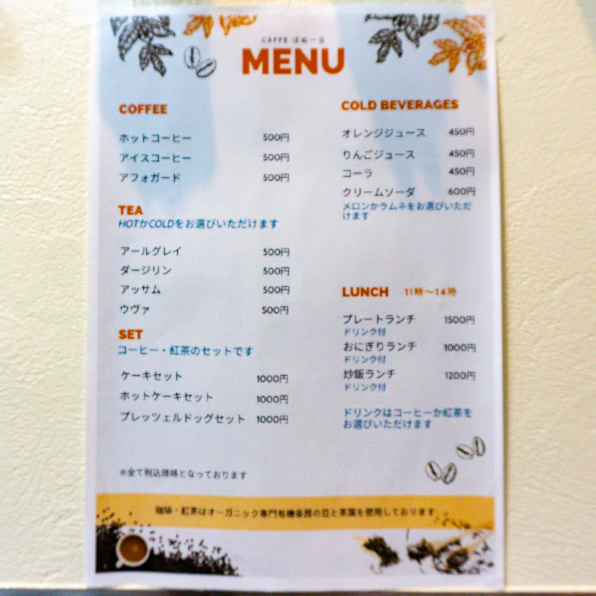 ランチメニューのほかにコーヒーや紅茶も種類が豊富でした。
