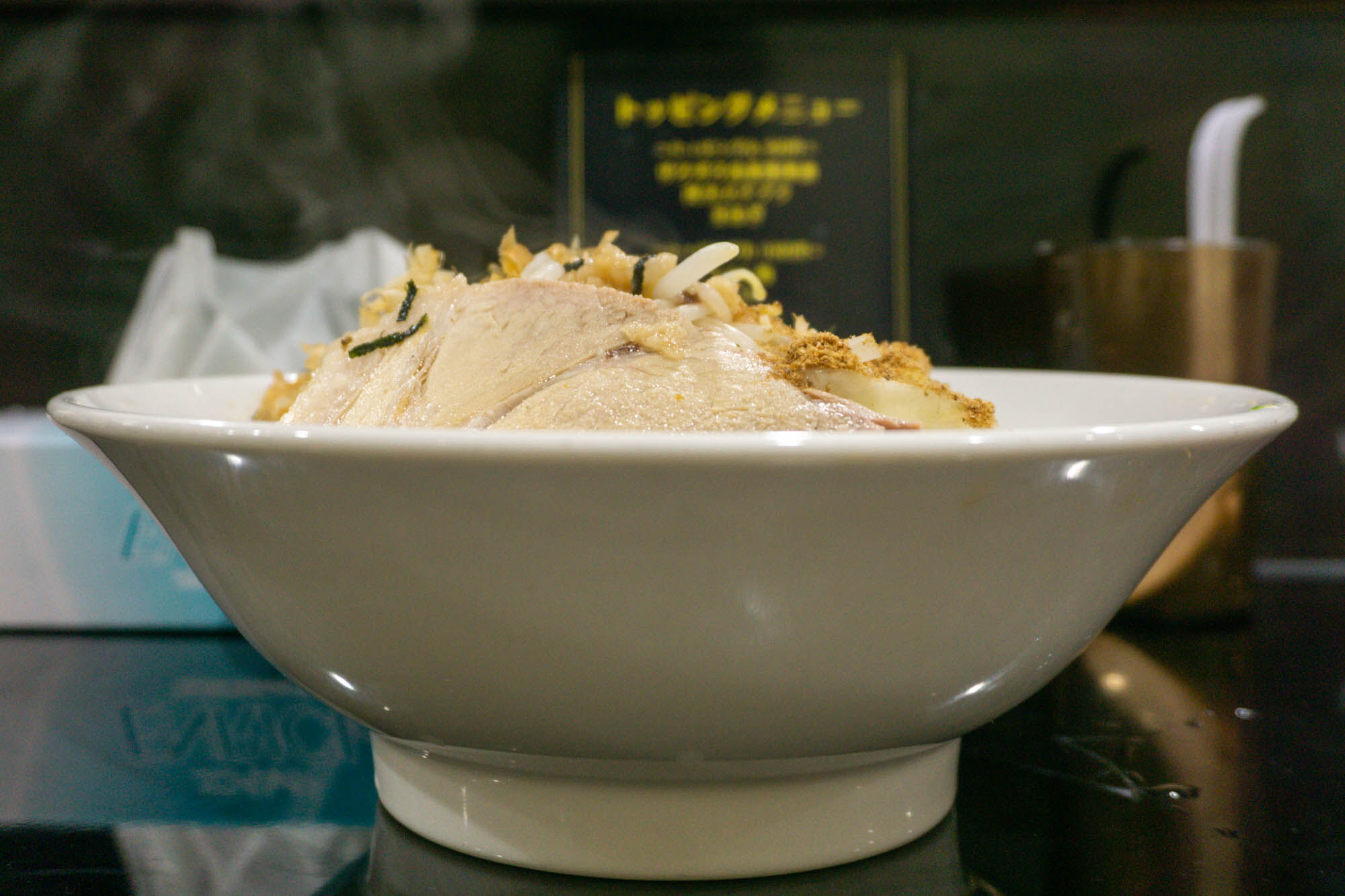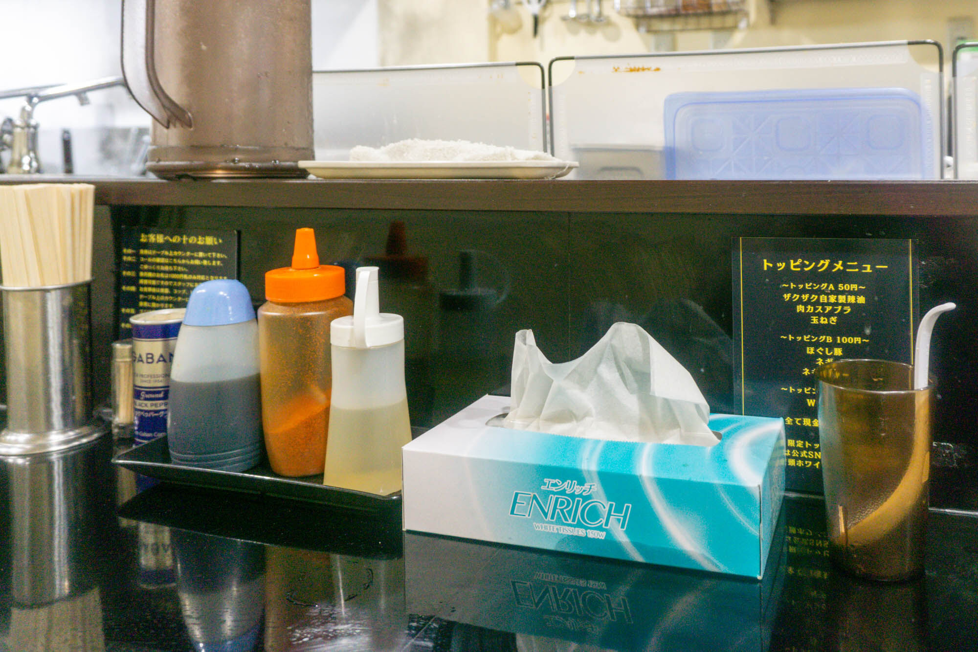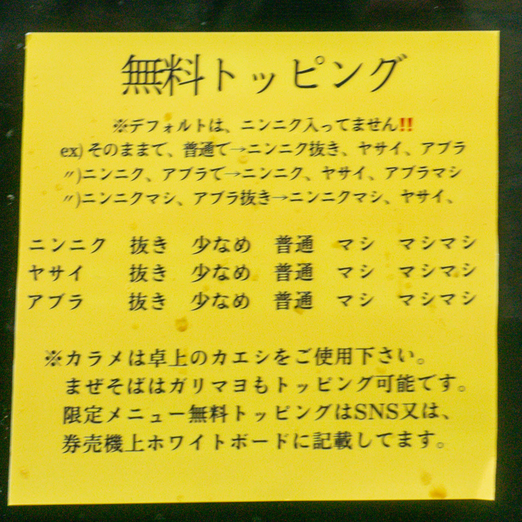 ちなみにトッピングは席にも詳細の書かれた紙が貼ってあります。現金購入もできるみたい。