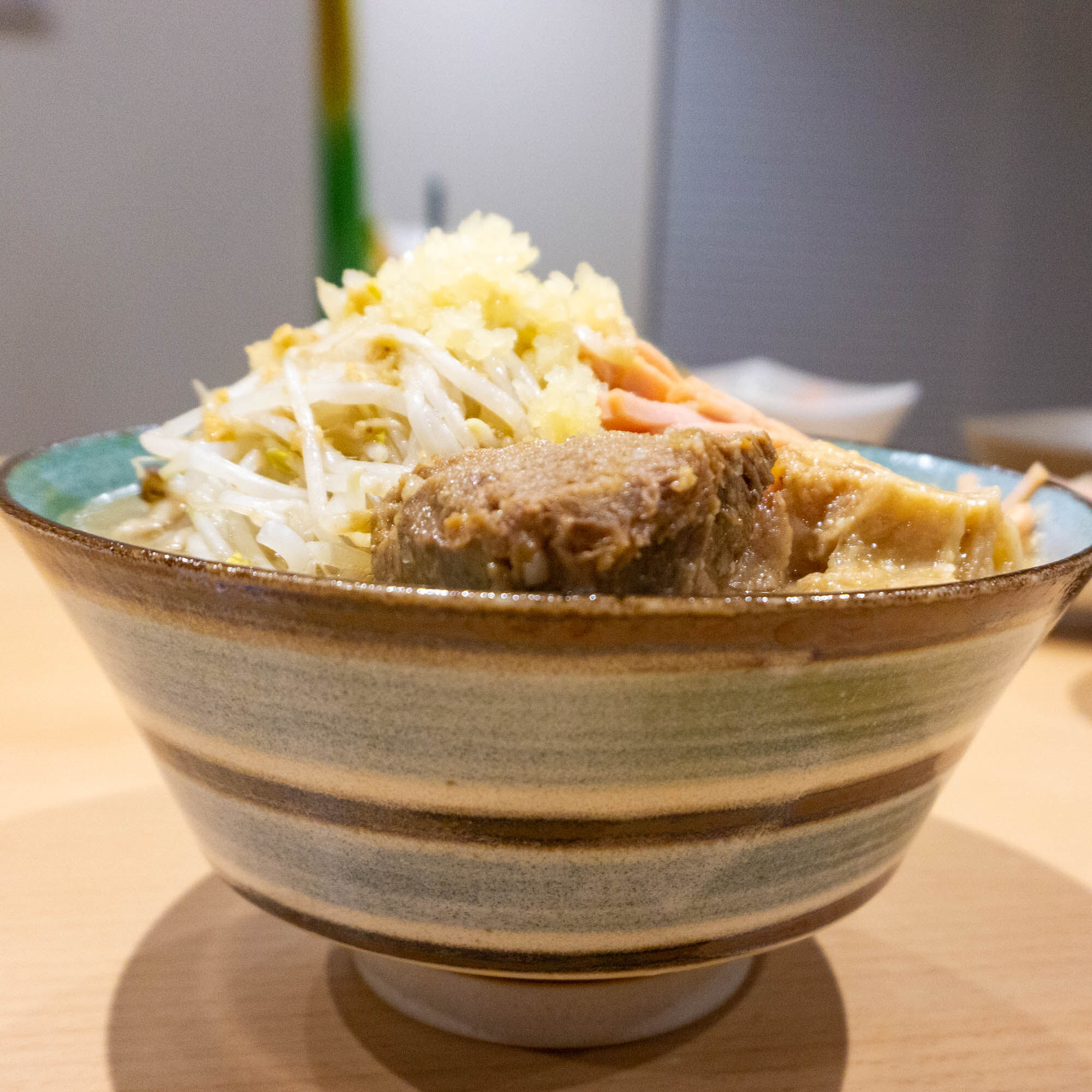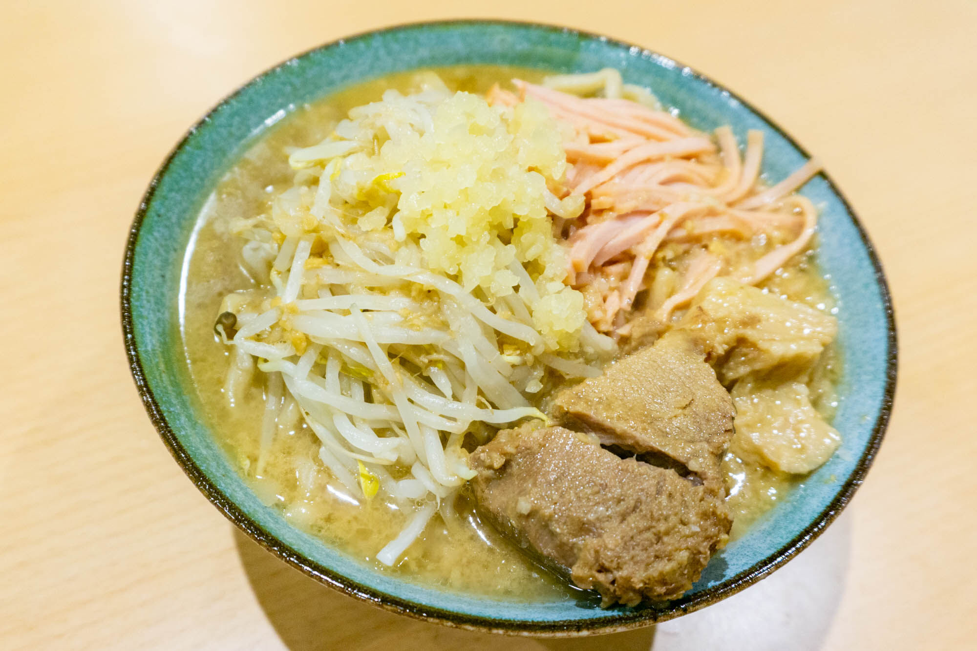 この丼、普通のラーメンなら余裕で収まる大きさなんですが、麺とスープをいれた段階でかなり上すれすれまでの量がありました。