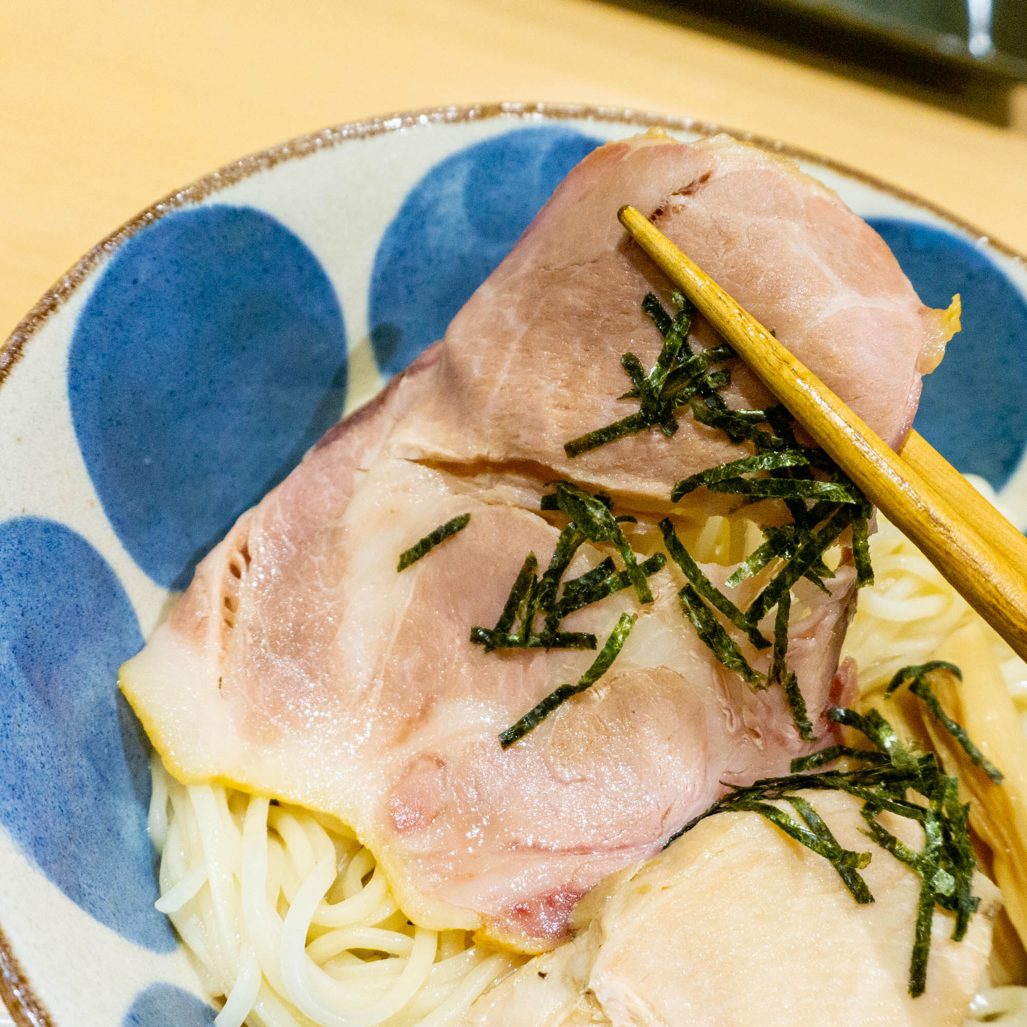 豚のチャーシューは薄切りで油がのってます。つけ汁にからめて食べると、とろとろでおいしい〜!