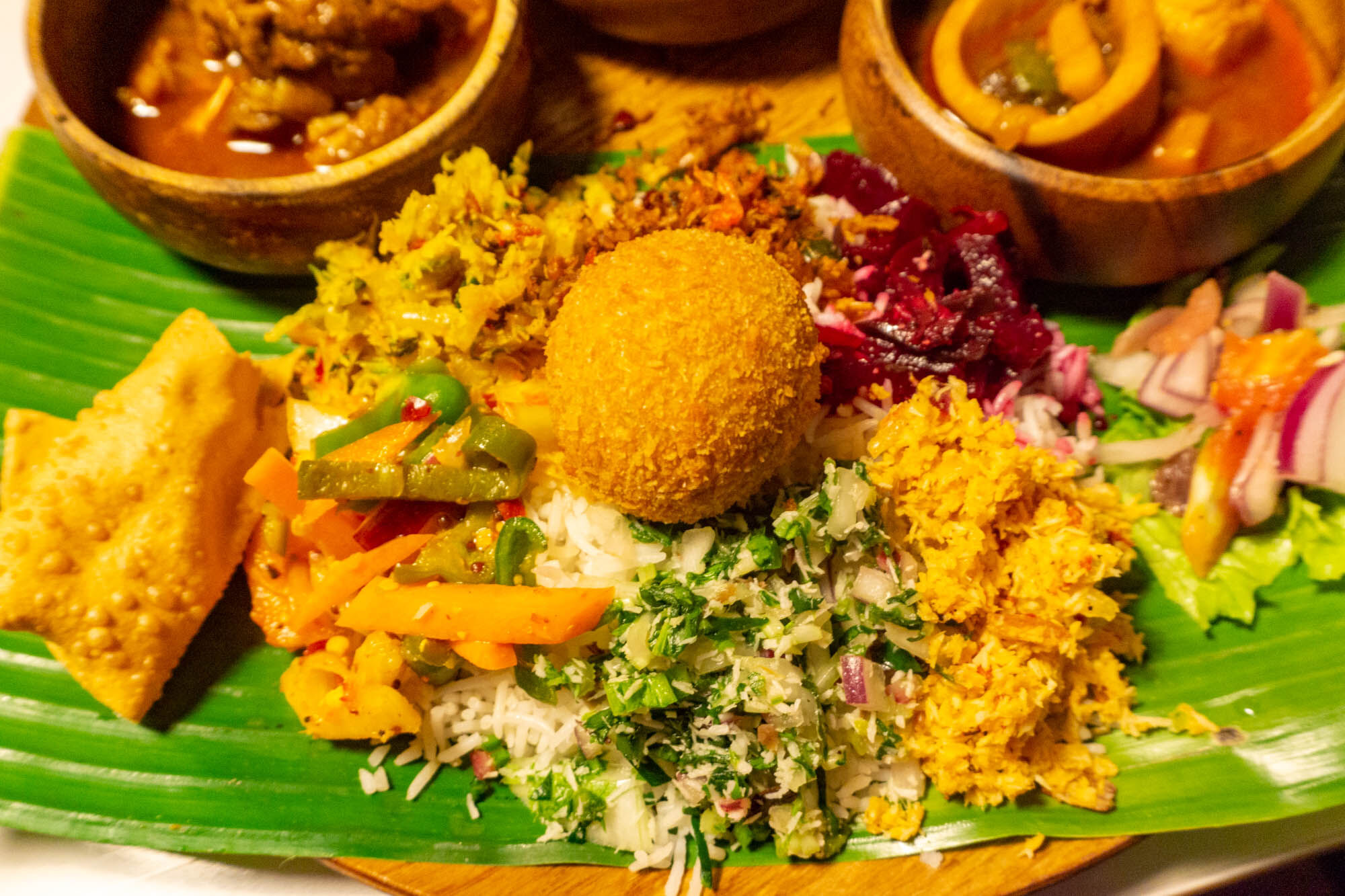 鮮やか〜〜!バナナリーフが下に敷かれていて異国料理を食べに来た気持ちがあがります♪