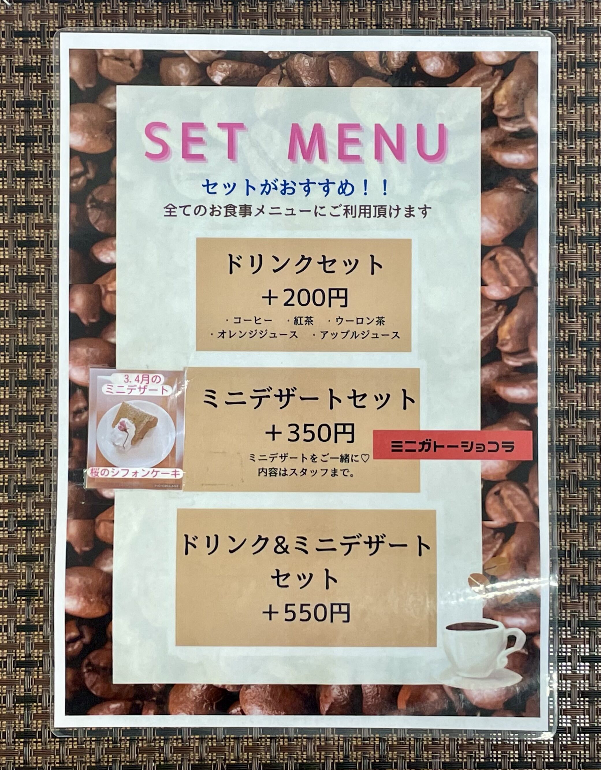 ドリンクやデザートは、セットにするとお得!