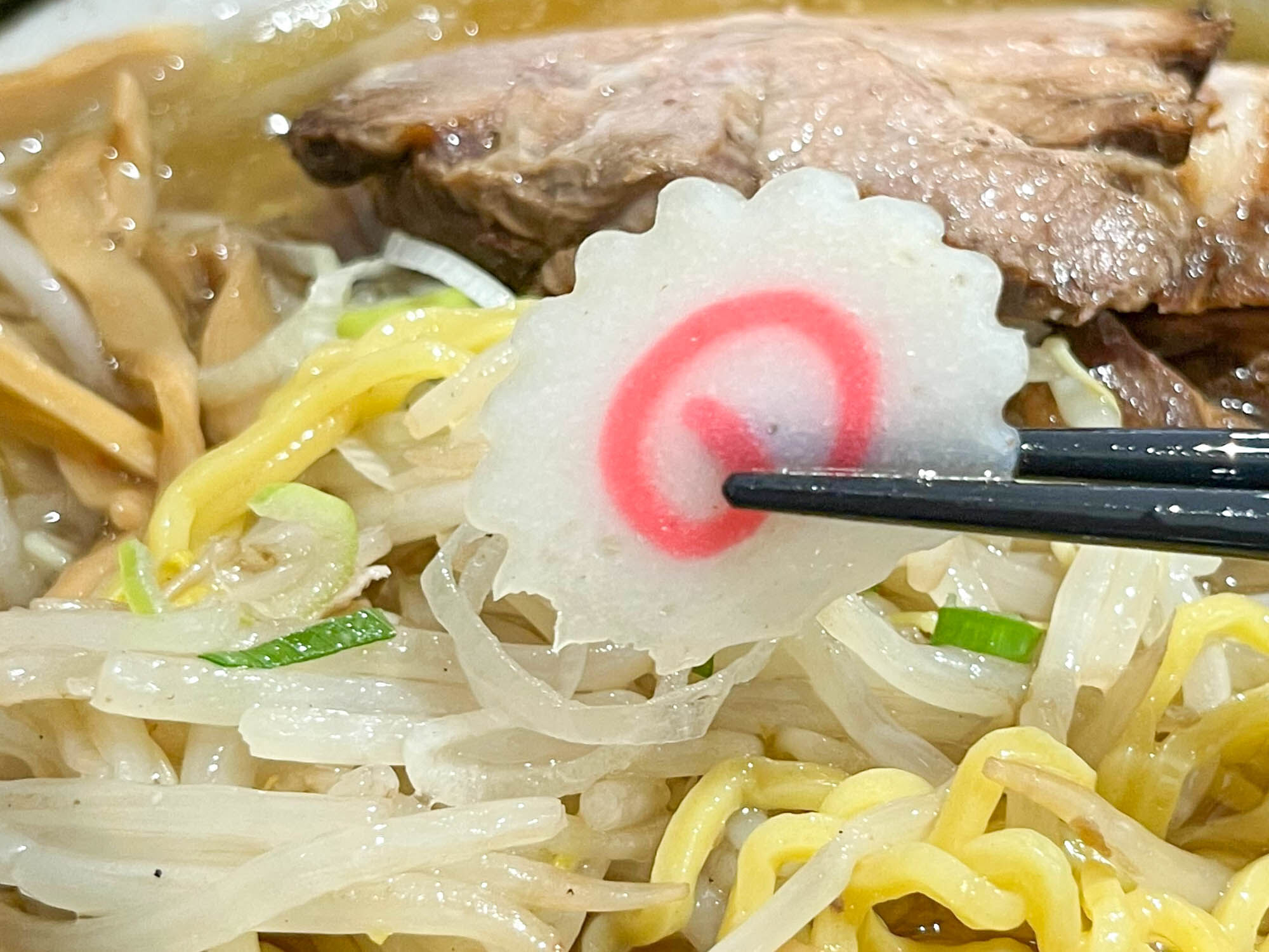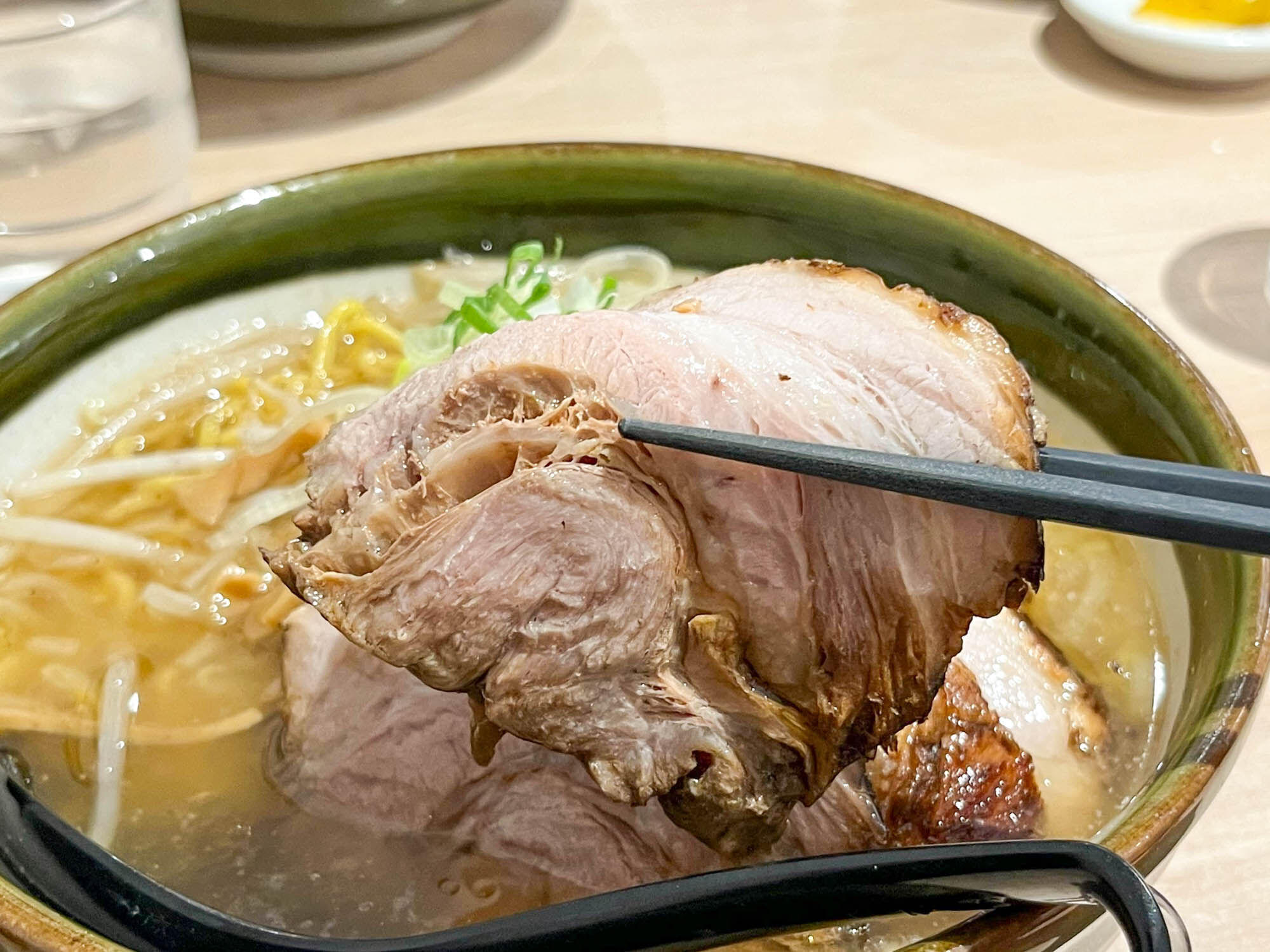 チャーシューは肉厚でぎゅっと詰まった感じ。それでいて柔らかくホロホロして美味。