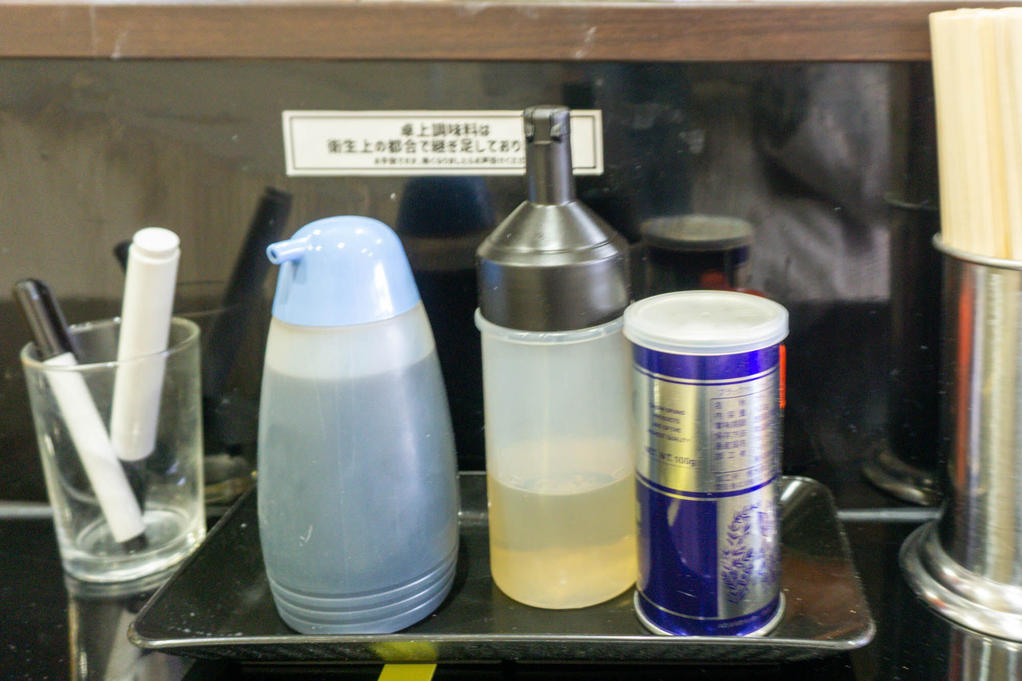 卓上には「カエシ・酢・ブラックペッパー」が並んでいます。