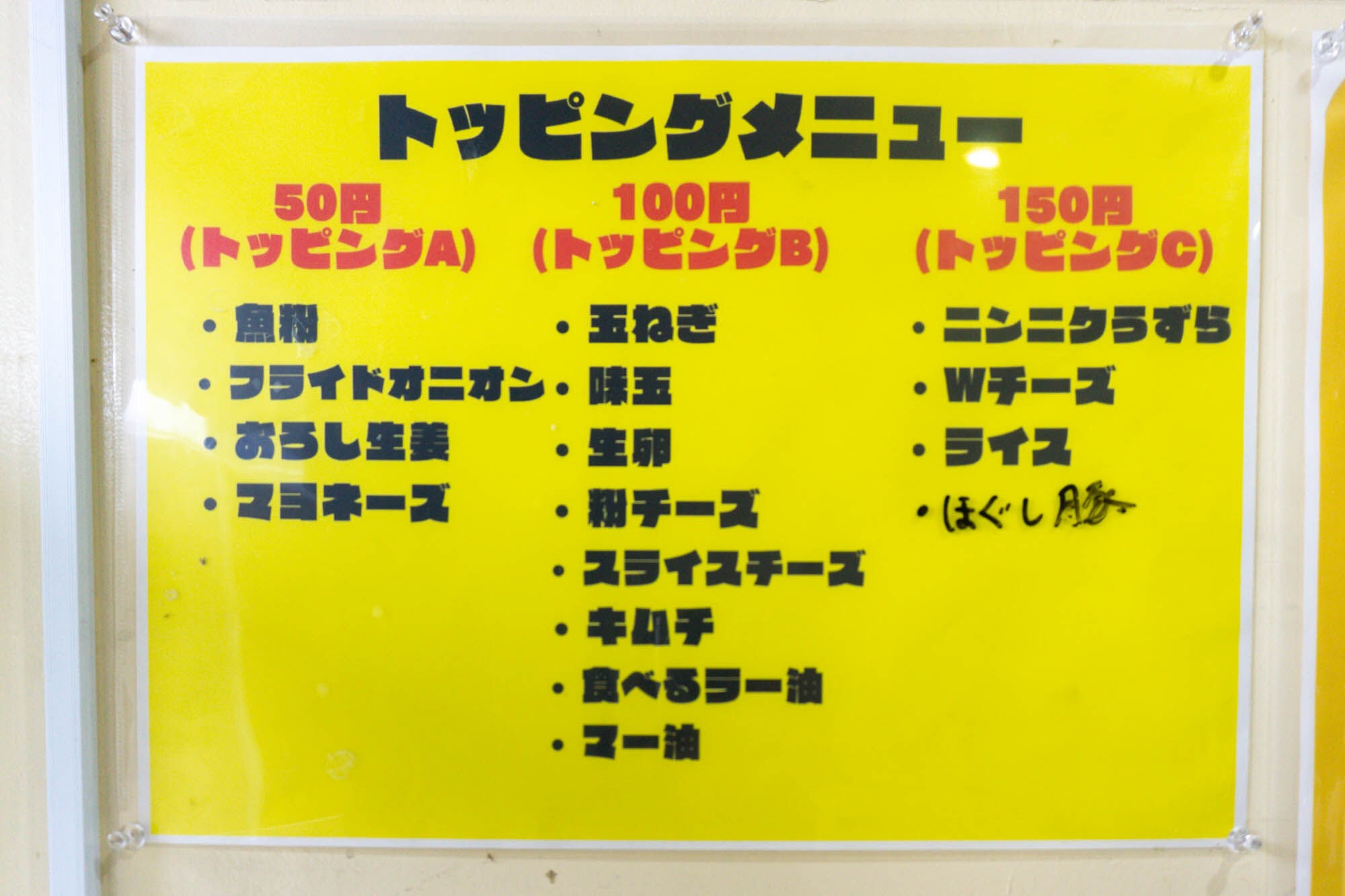金額別のトッピングメニューは券売機上に貼紙が貼ってありました。