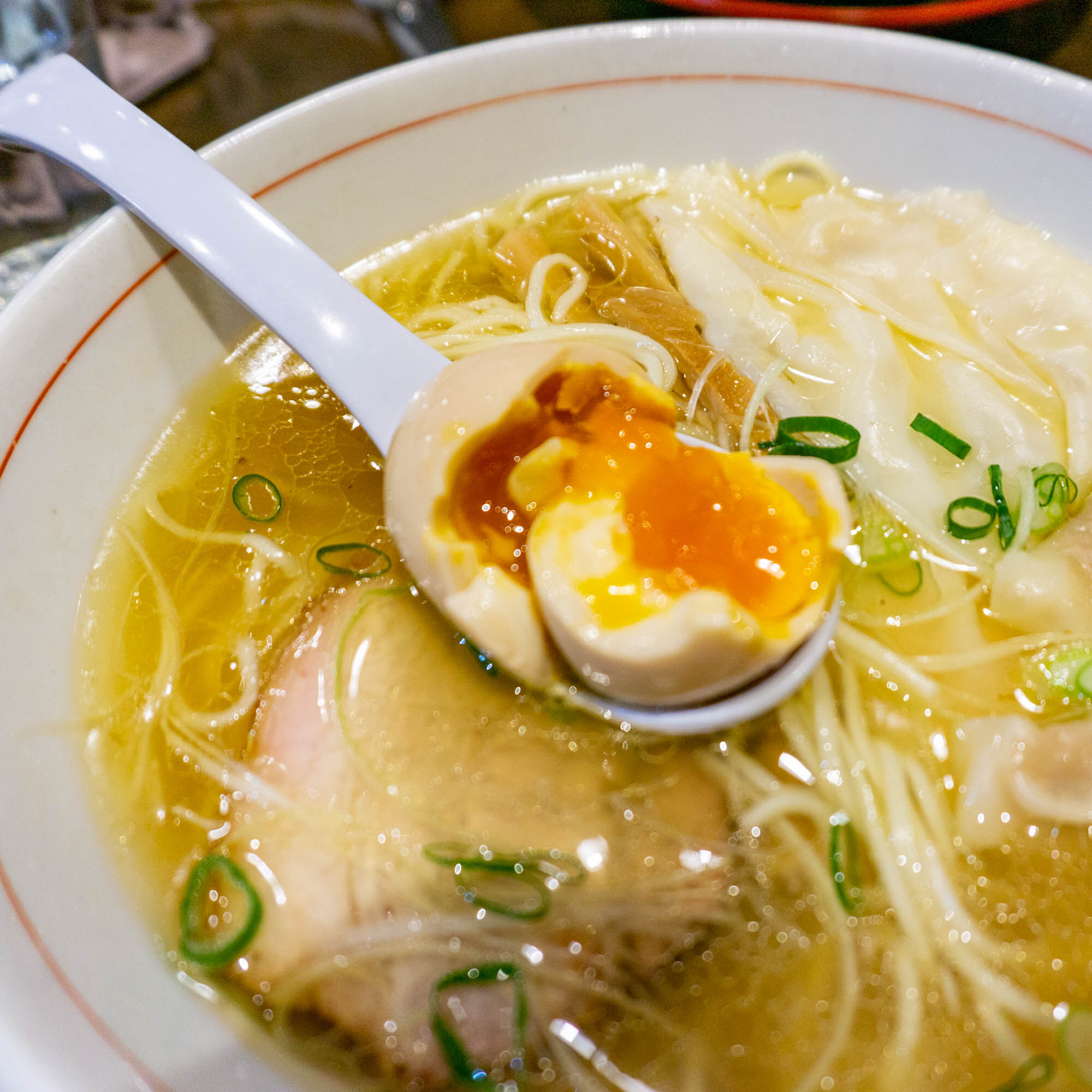 今回は得のせ塩らぁめんということで通常の塩らぁめんに「味玉」と「肉入り皮雲呑」がプラス。通常別々のトッピングだと2つで220円のところが150円に!まさに「得のせ」。