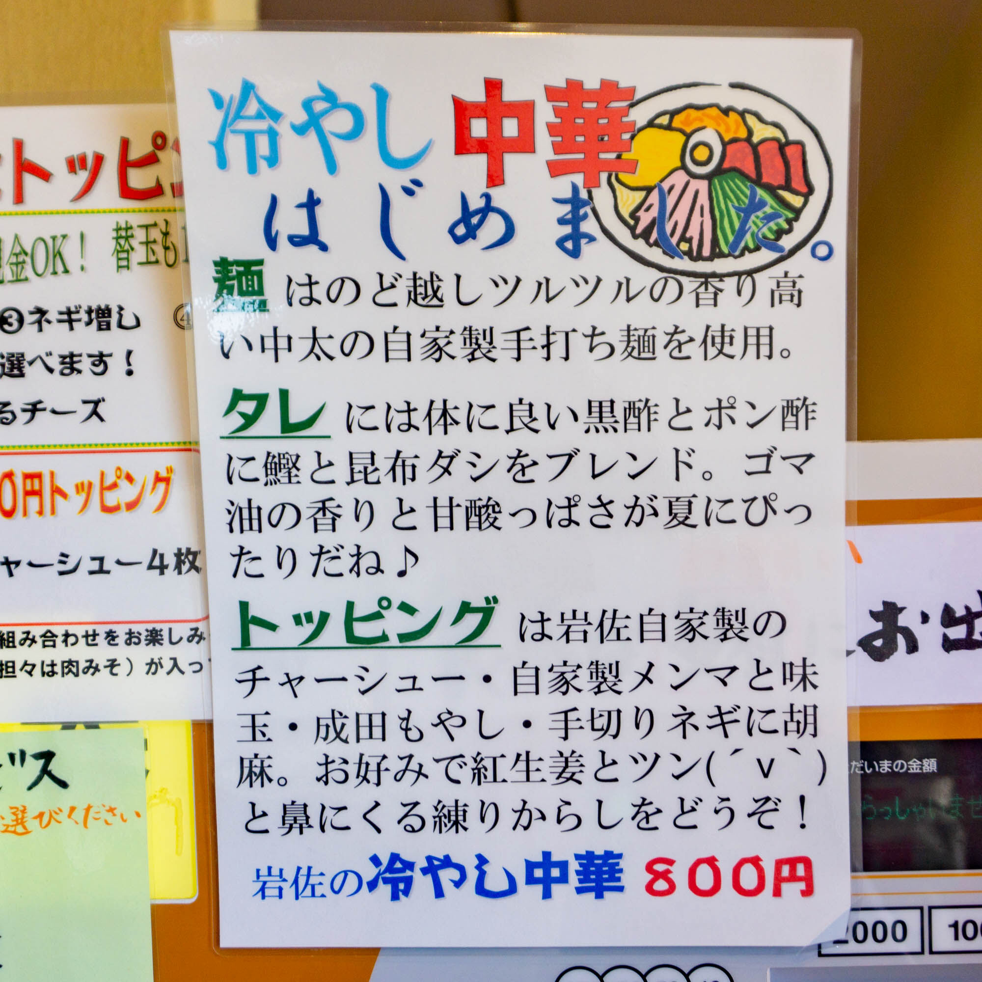 「冷やし中華はじめました。」ポップが券売機や入口にも貼ってありました。