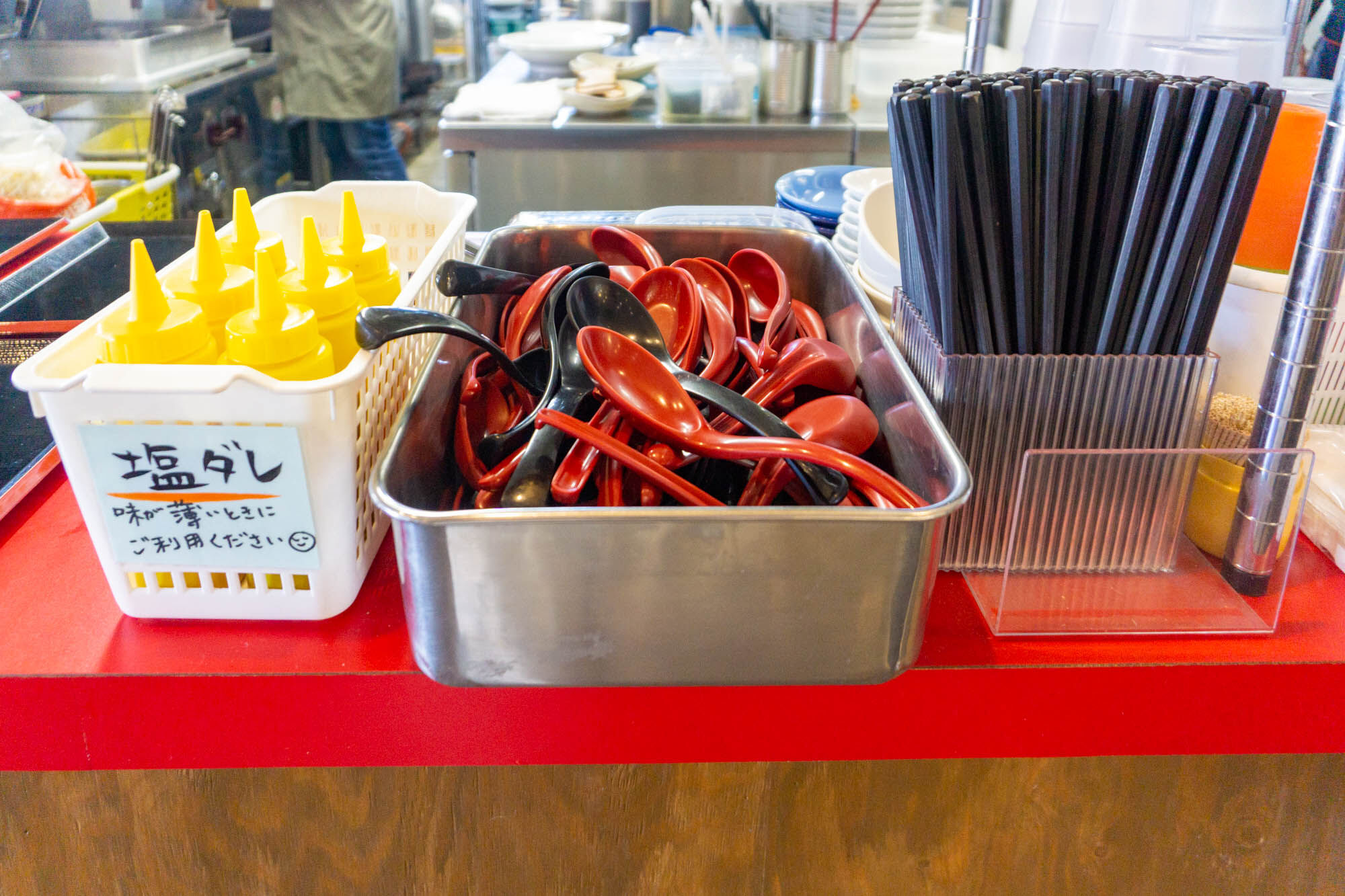 出来上がった「冷やし中華」を取りに行き、横にあるここからお箸やレンゲ等を持っていきます。