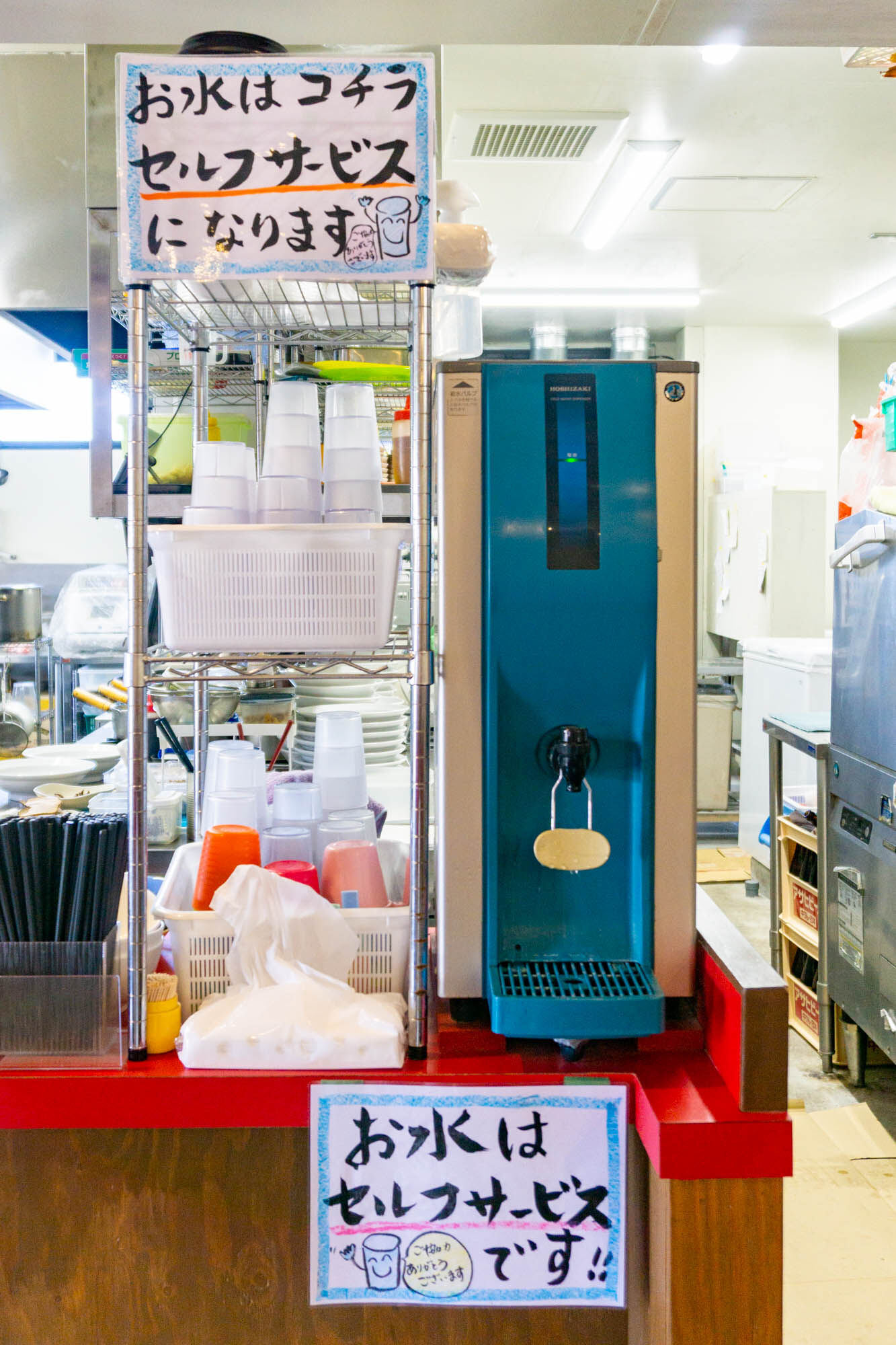 お水はセルフサービスで、ここで自分で用意して席に持っていきます。