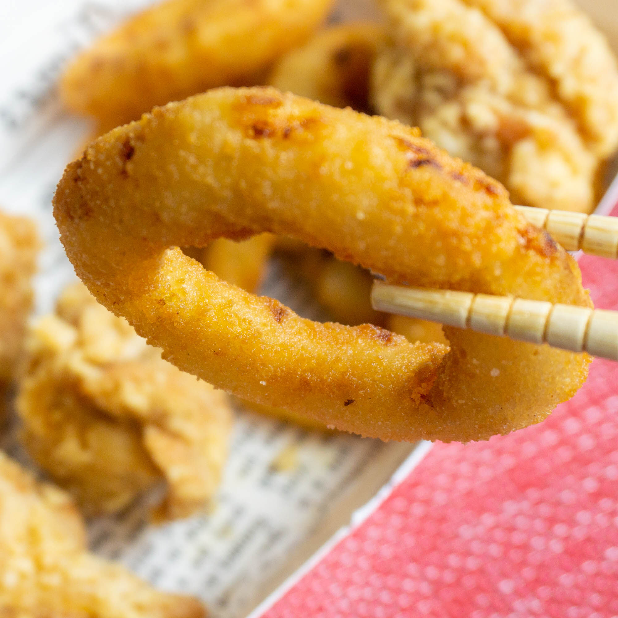 オニオンフライは衣が厚め。食べるとザクザク感よりサクサクもっちり感が強いです。
