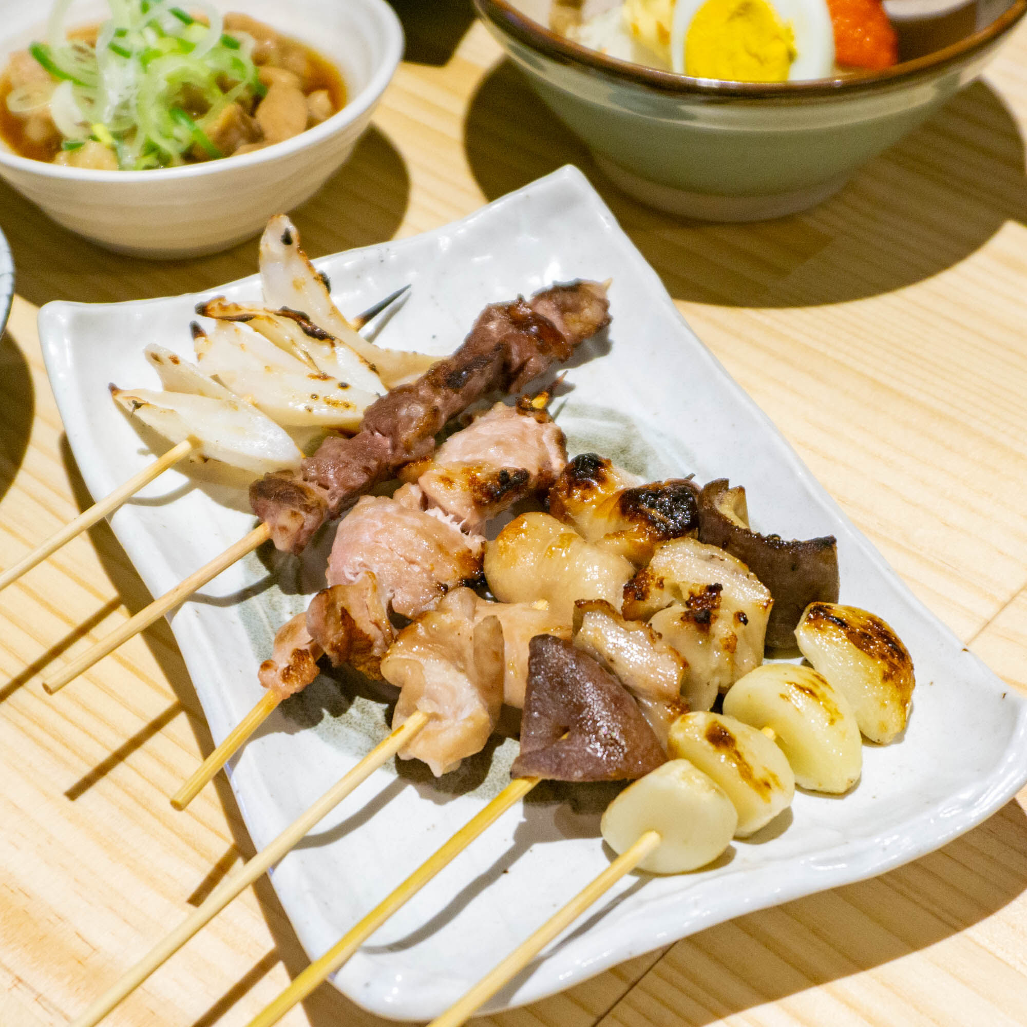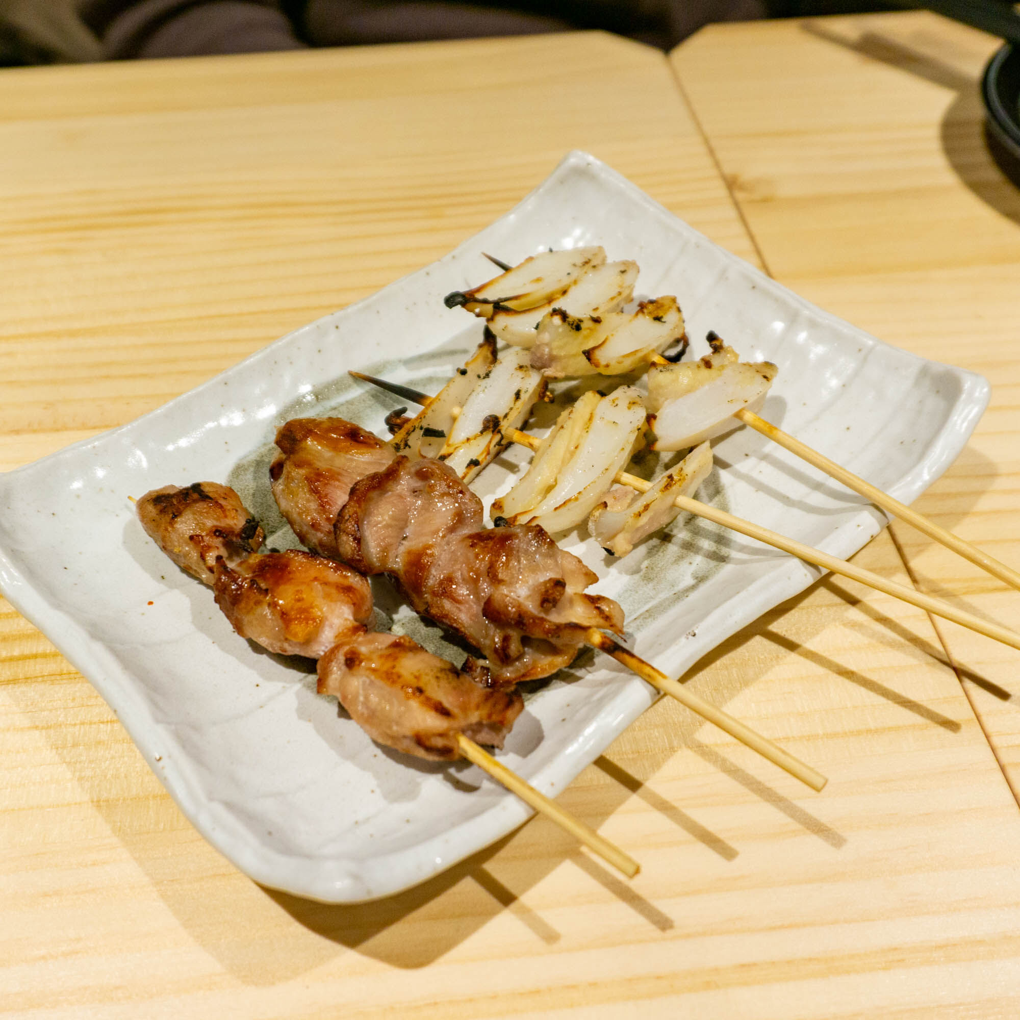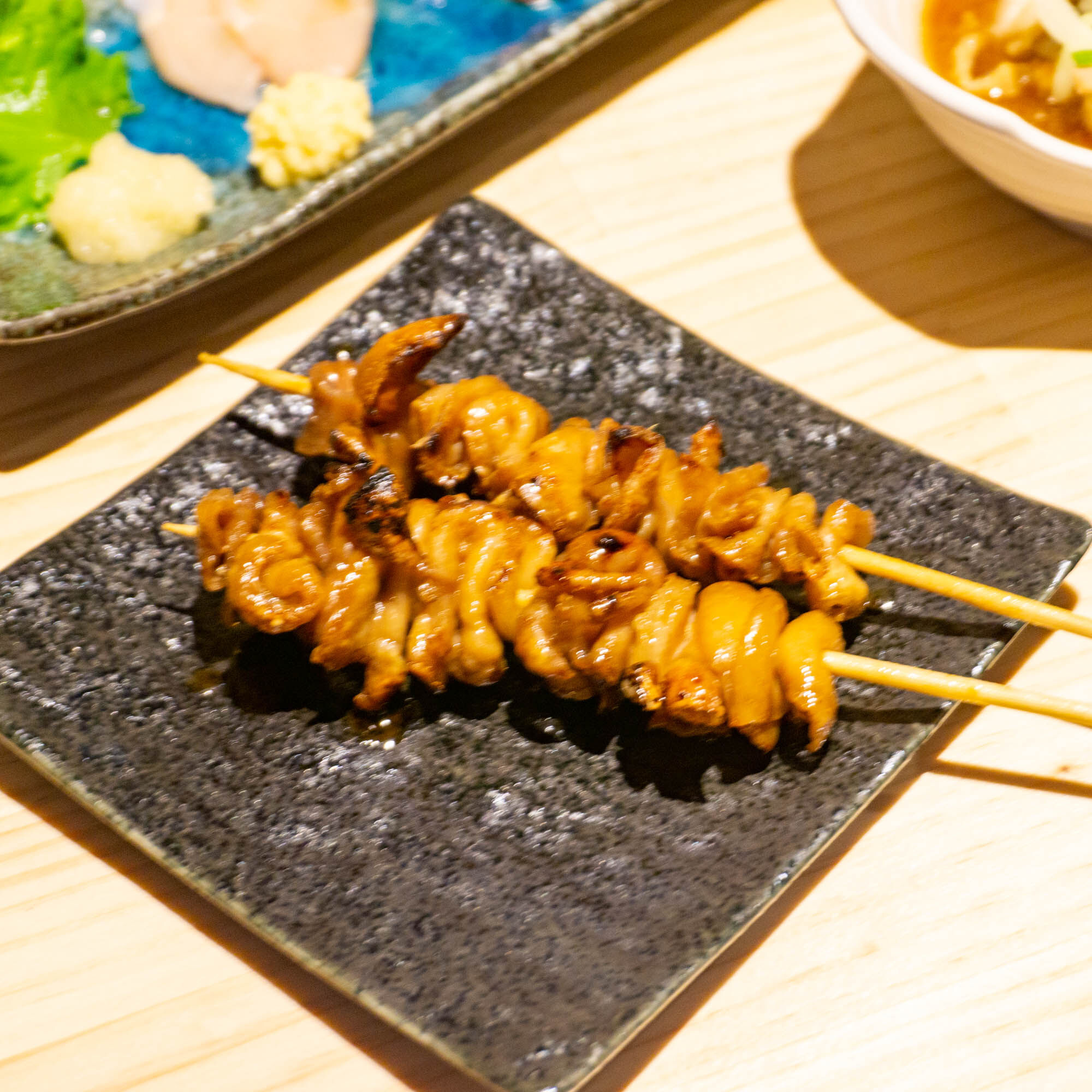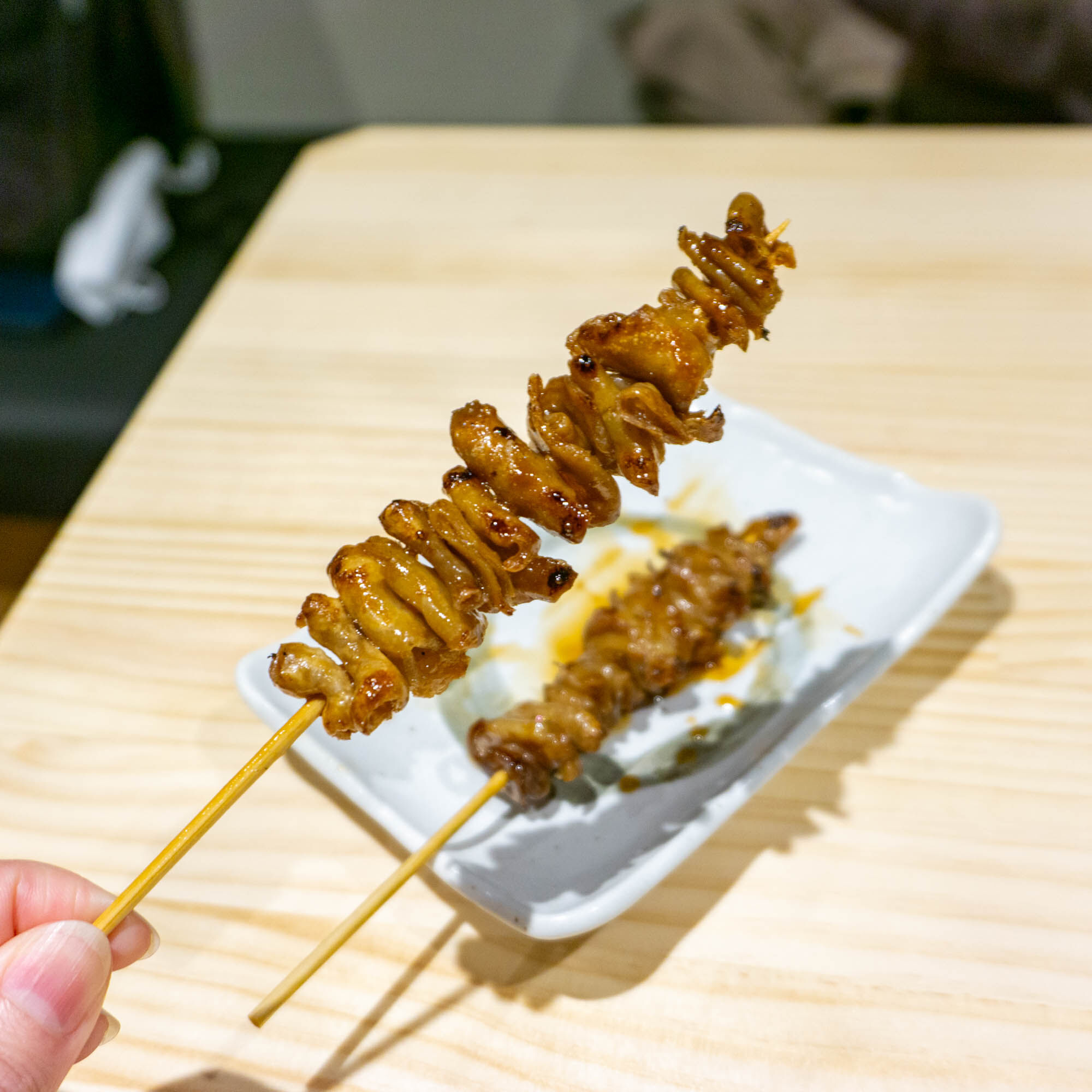 「シロ」という部位を茹でて、揚げてからタレを付けて焼くという手間暇かけてつくられた串焼きだそう。