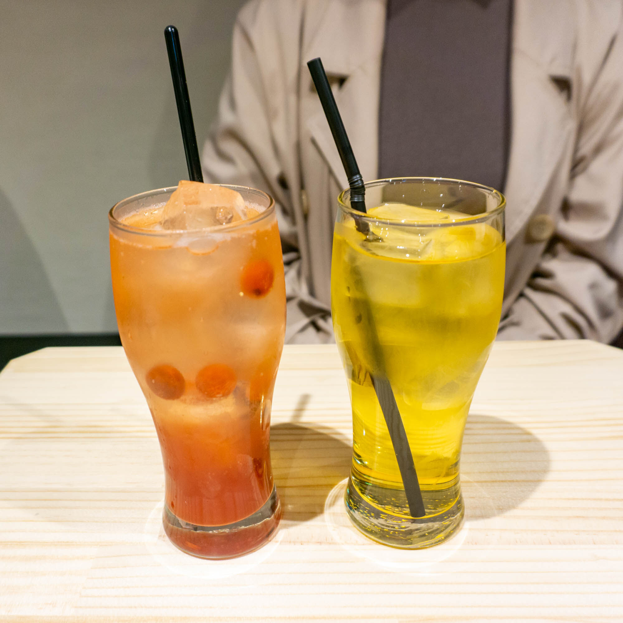 ドリンクは「カリカリ梅干しサワー(605円)(左)・ジャスミン茶(330円)(右)」を注文。