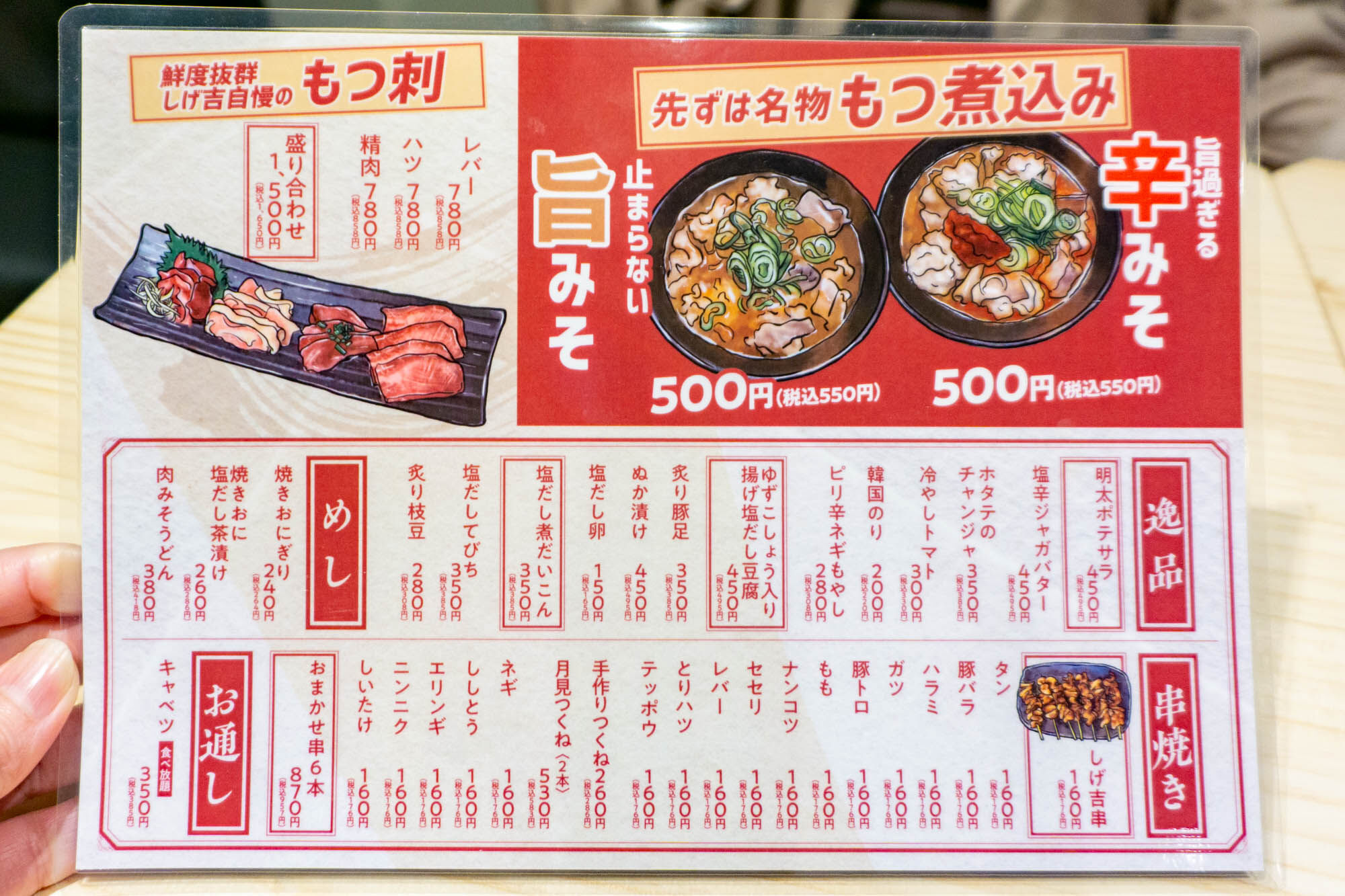 「もつ焼しげ吉」の『もつ煮込み・しげ吉串・もつ刺』など(大和市大和南)【やまとぴグルメ】