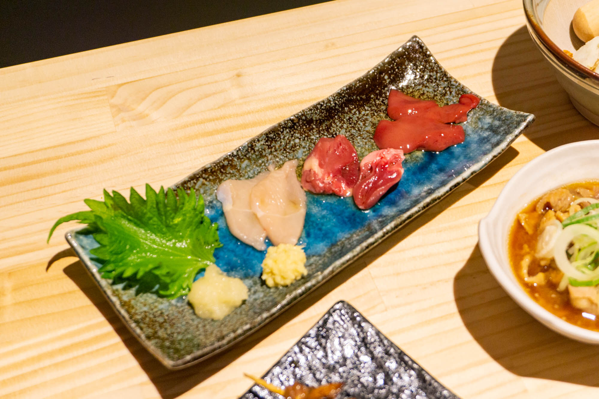 お次は「もつ刺 盛り合わせ」(1650円)。左から鶏肉・ハツ・レバーとのこと。