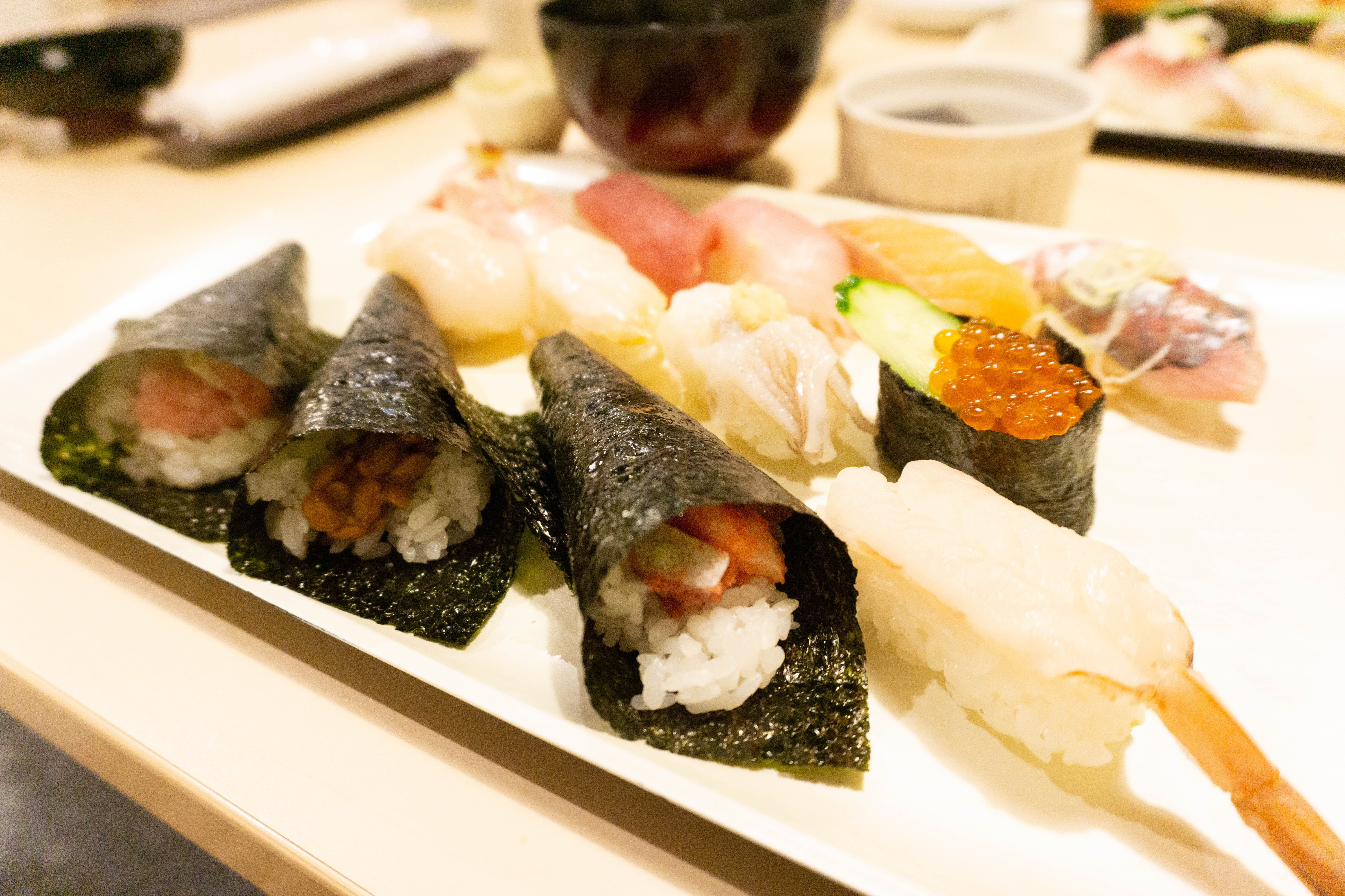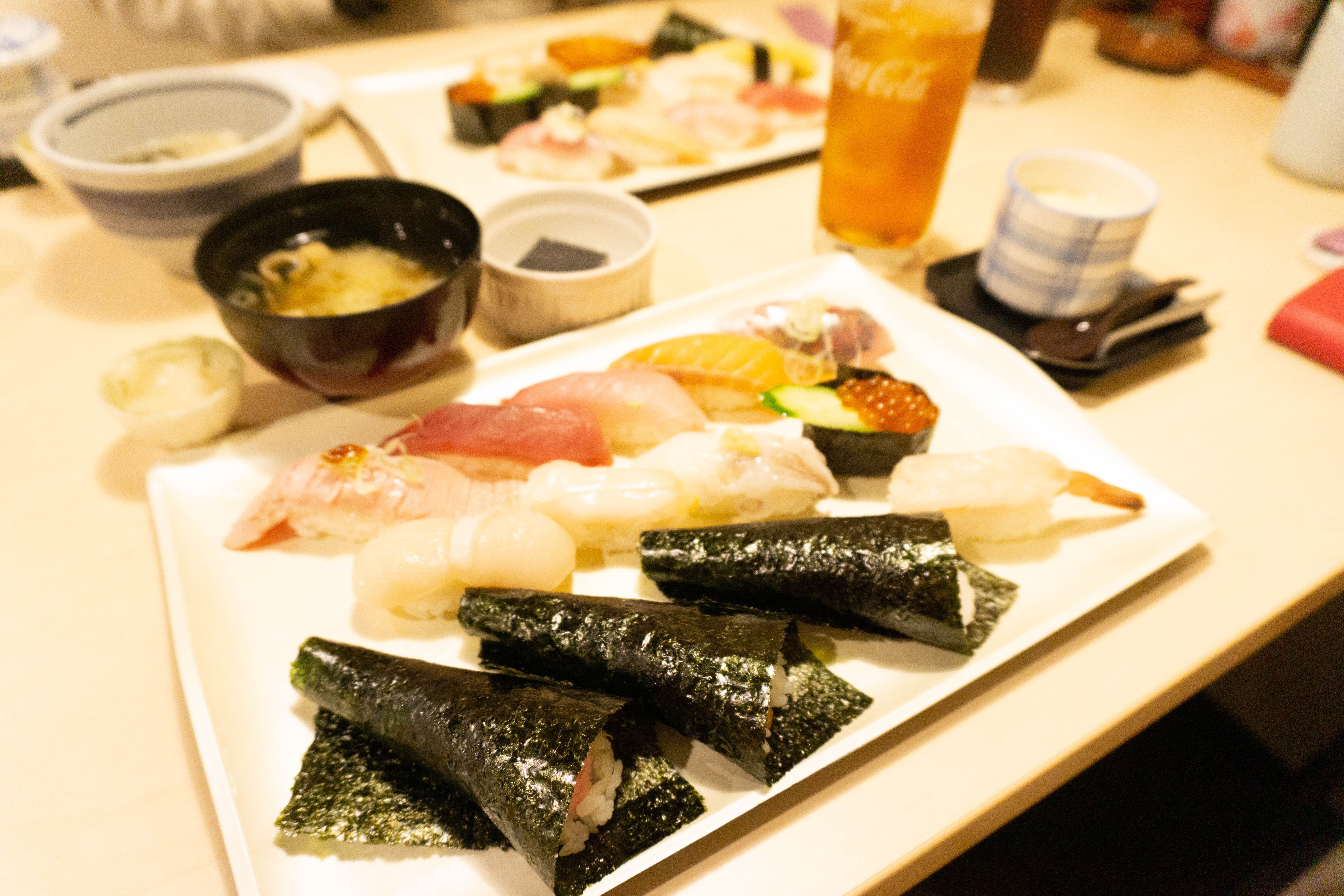 にぎりは「地あじ・つぶ貝・やりいか生げそ・ねぎとろ軍艦・なっとう軍艦・サーモン」を選びました!