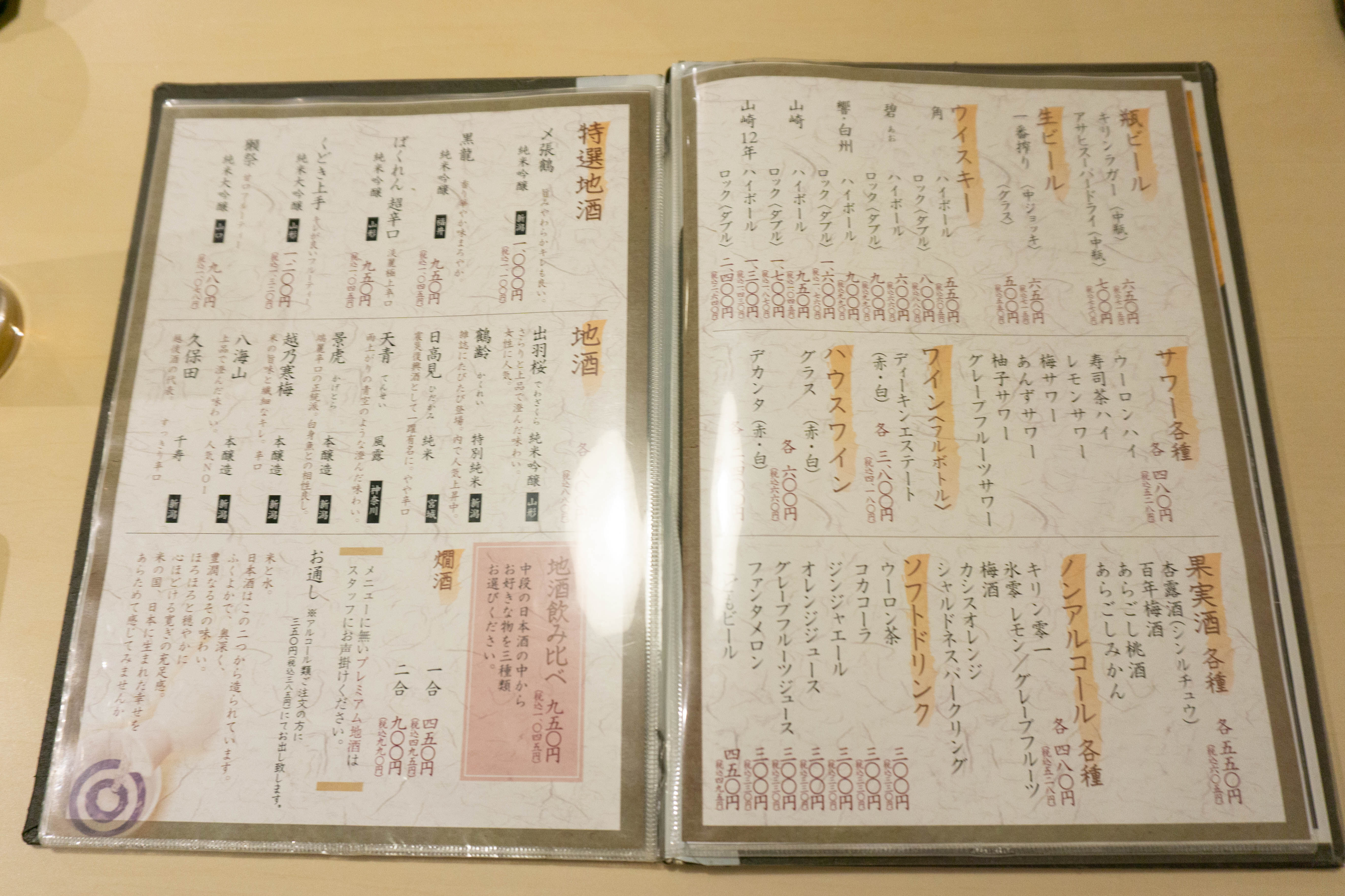 ドリンクメニュー各種。ビール、洋酒、地酒、ソフトドリンクなど、たくさん種類が
