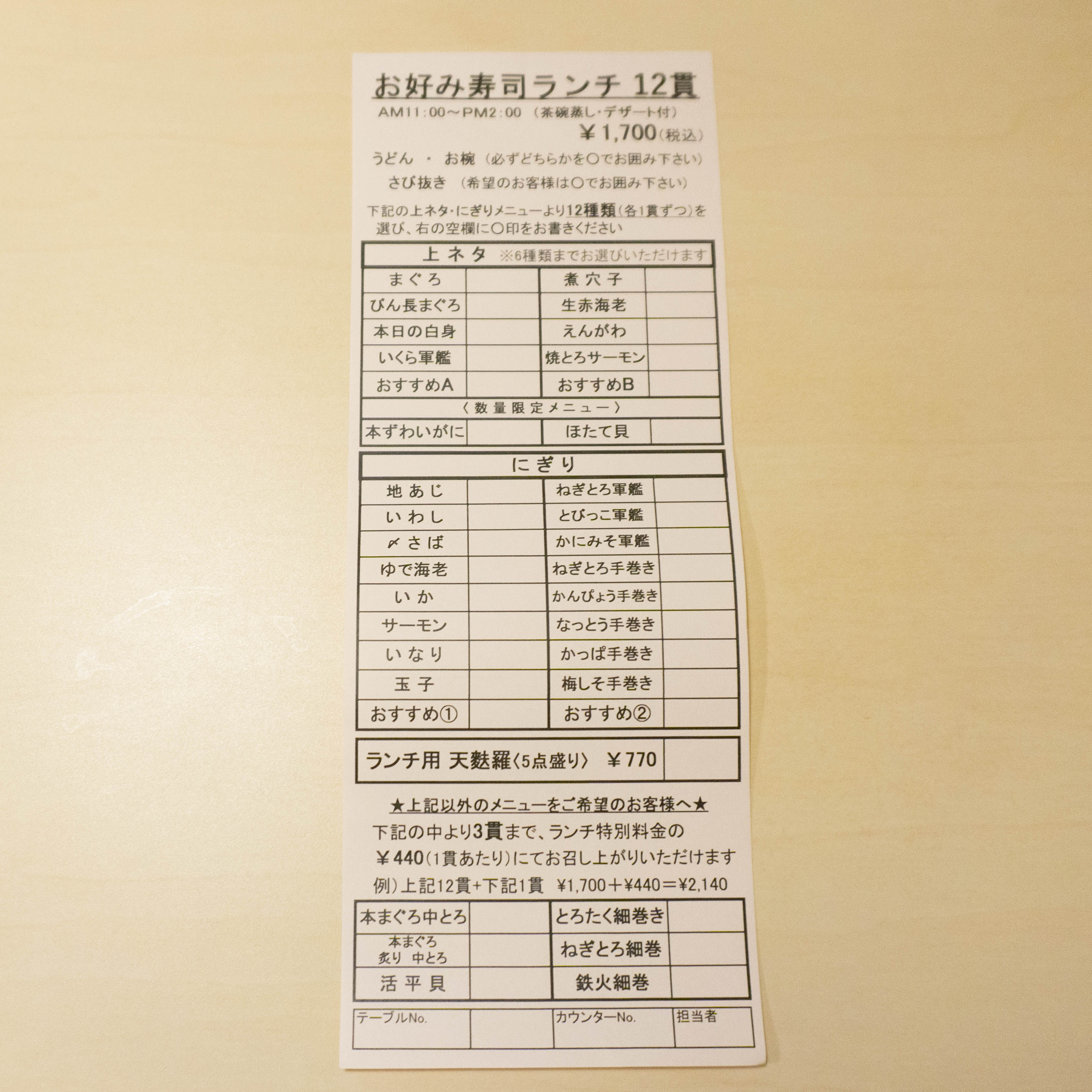 こちらが「お好み寿司ランチ12貫」の注文表。自分で好きなお寿司にチェックして、店員さんに渡すだけです。