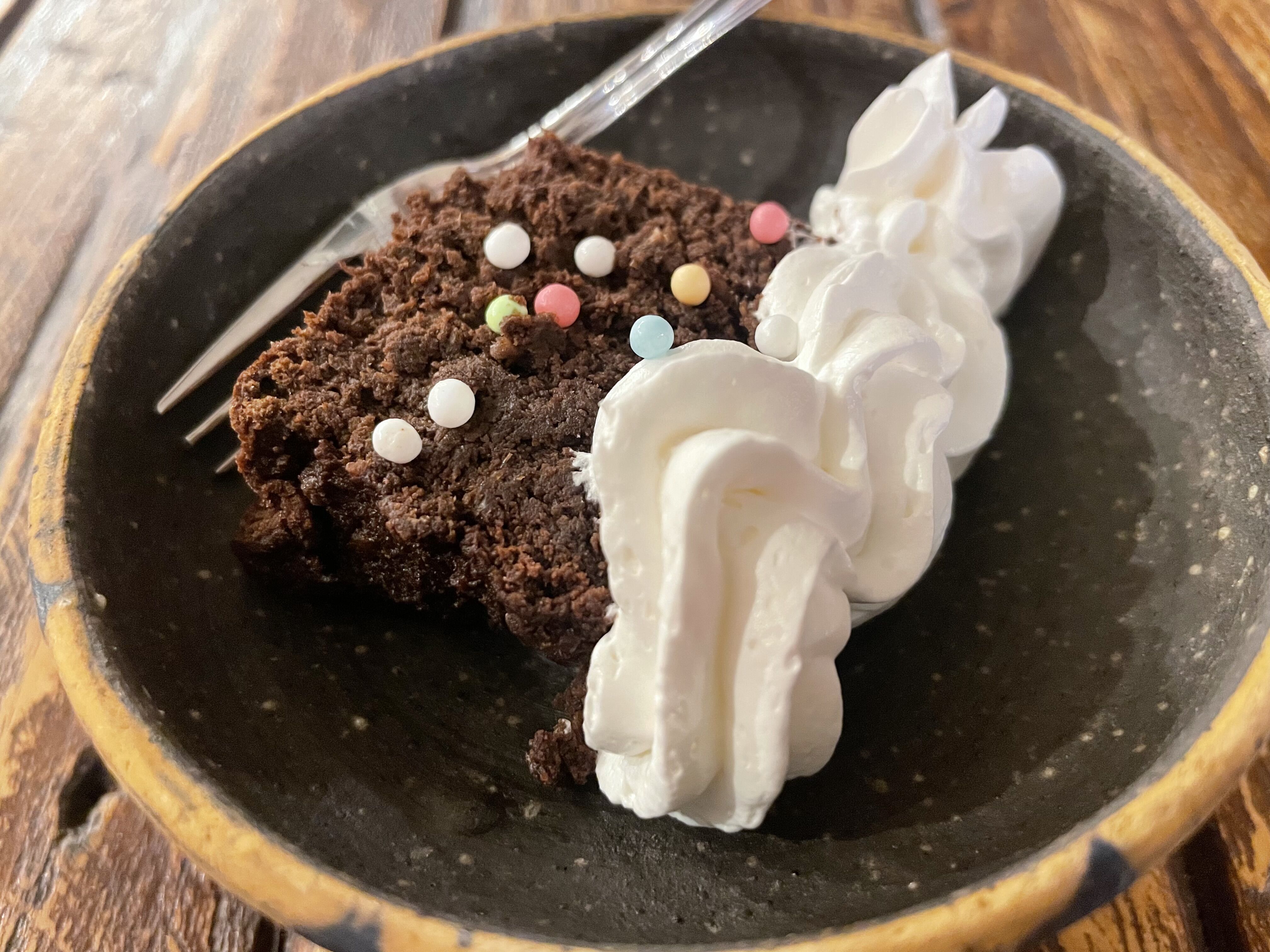 あっさりとした口当たりのいいガトーショコラに、カラフルなあられとホイップが乗っていました♪