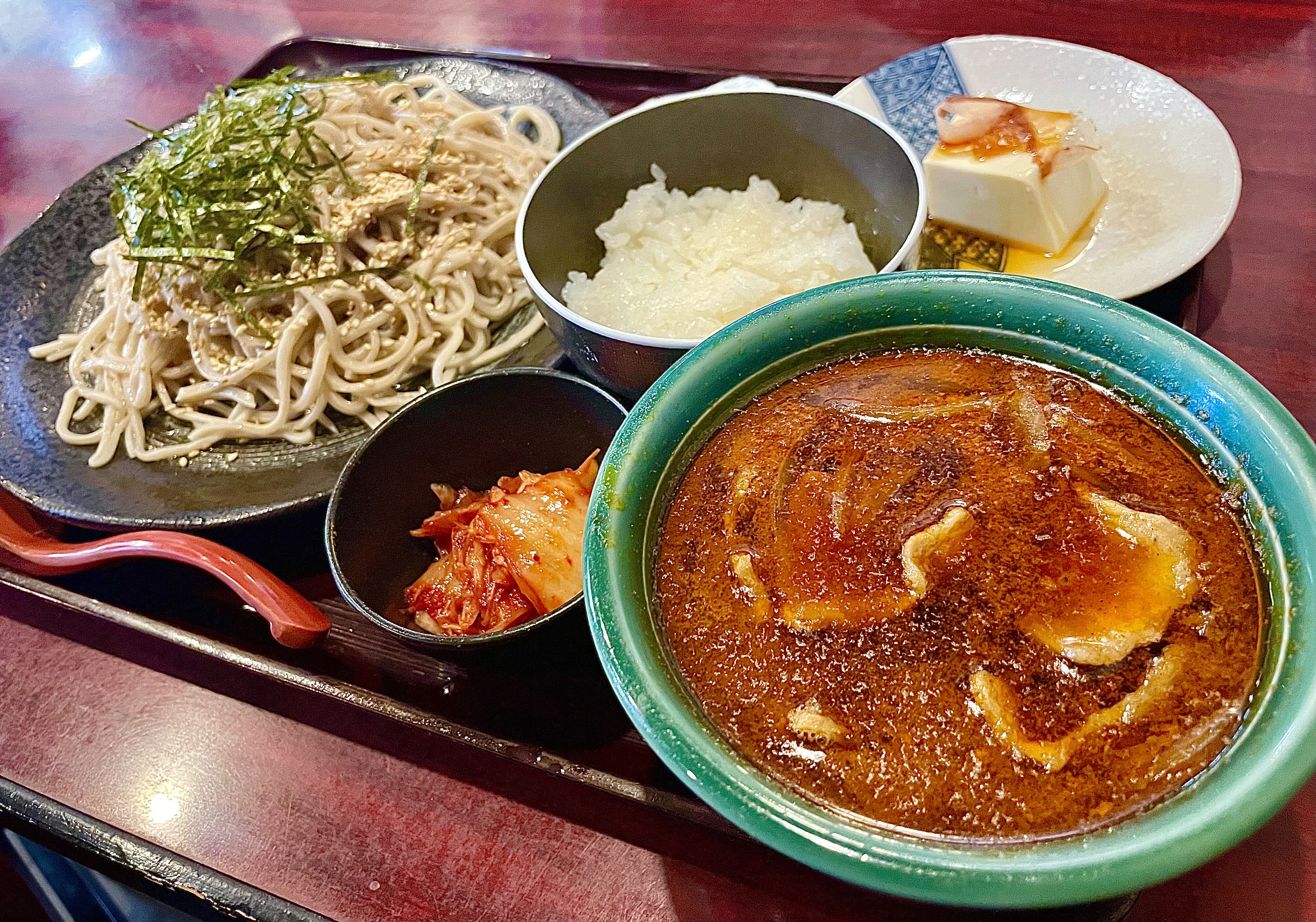 つけダレ、蕎麦、キムチ、冷奴、ご飯、葱がトレイに乗って届きました。