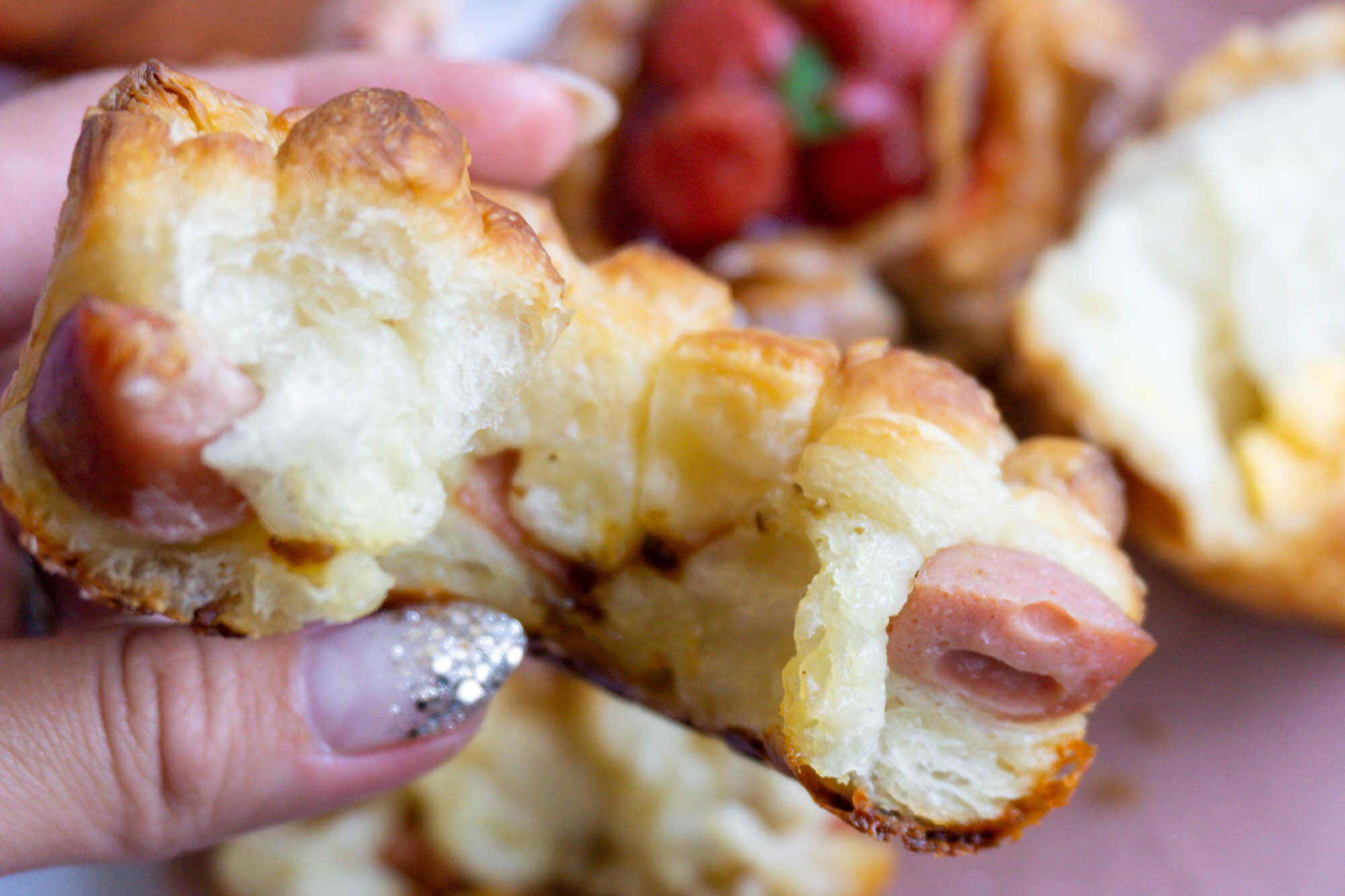 奥から「マカロン」「ソーセージとベーコンのゴツゴツクロワッサン」「いちごのデニッシュ」です。