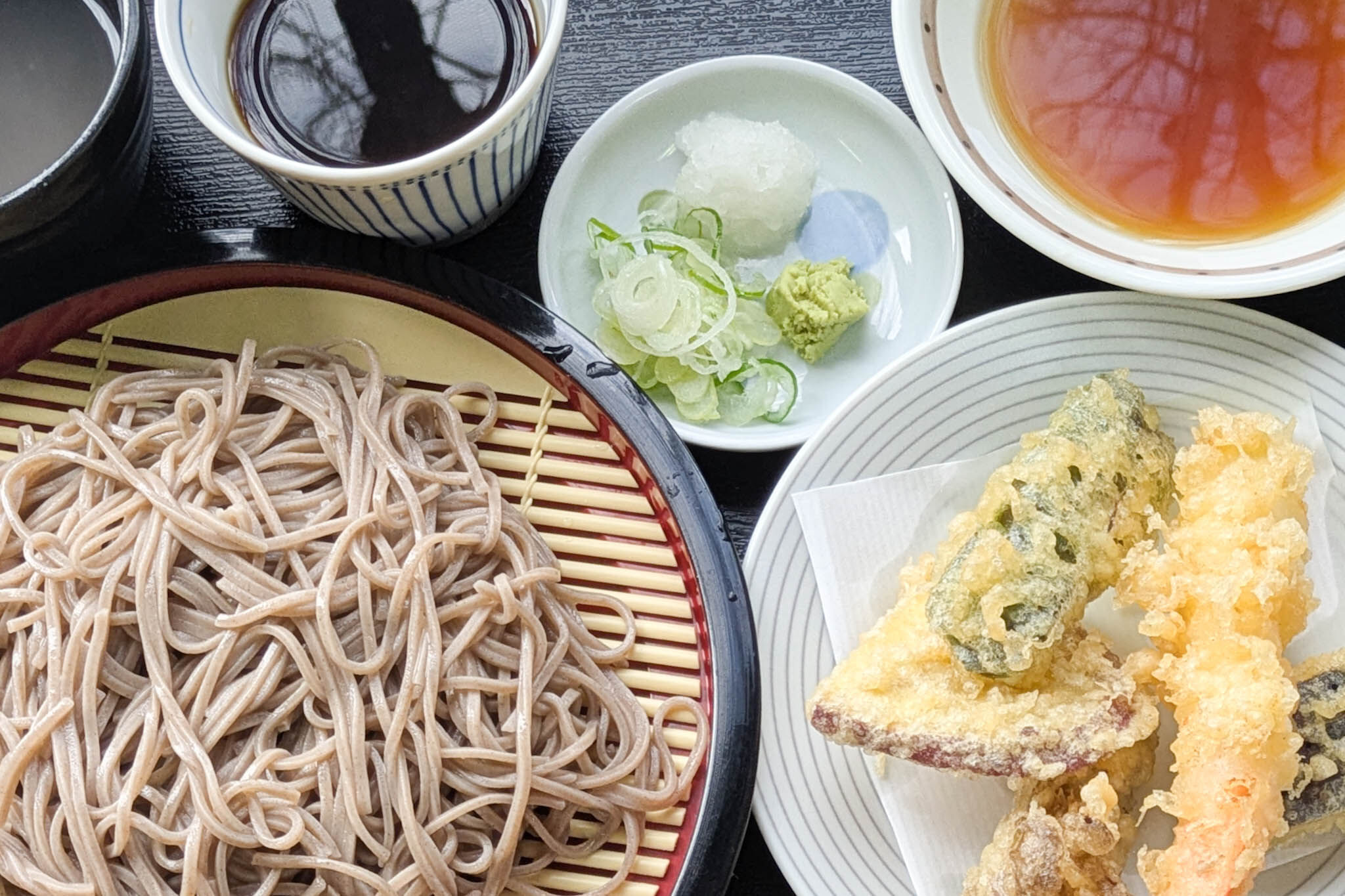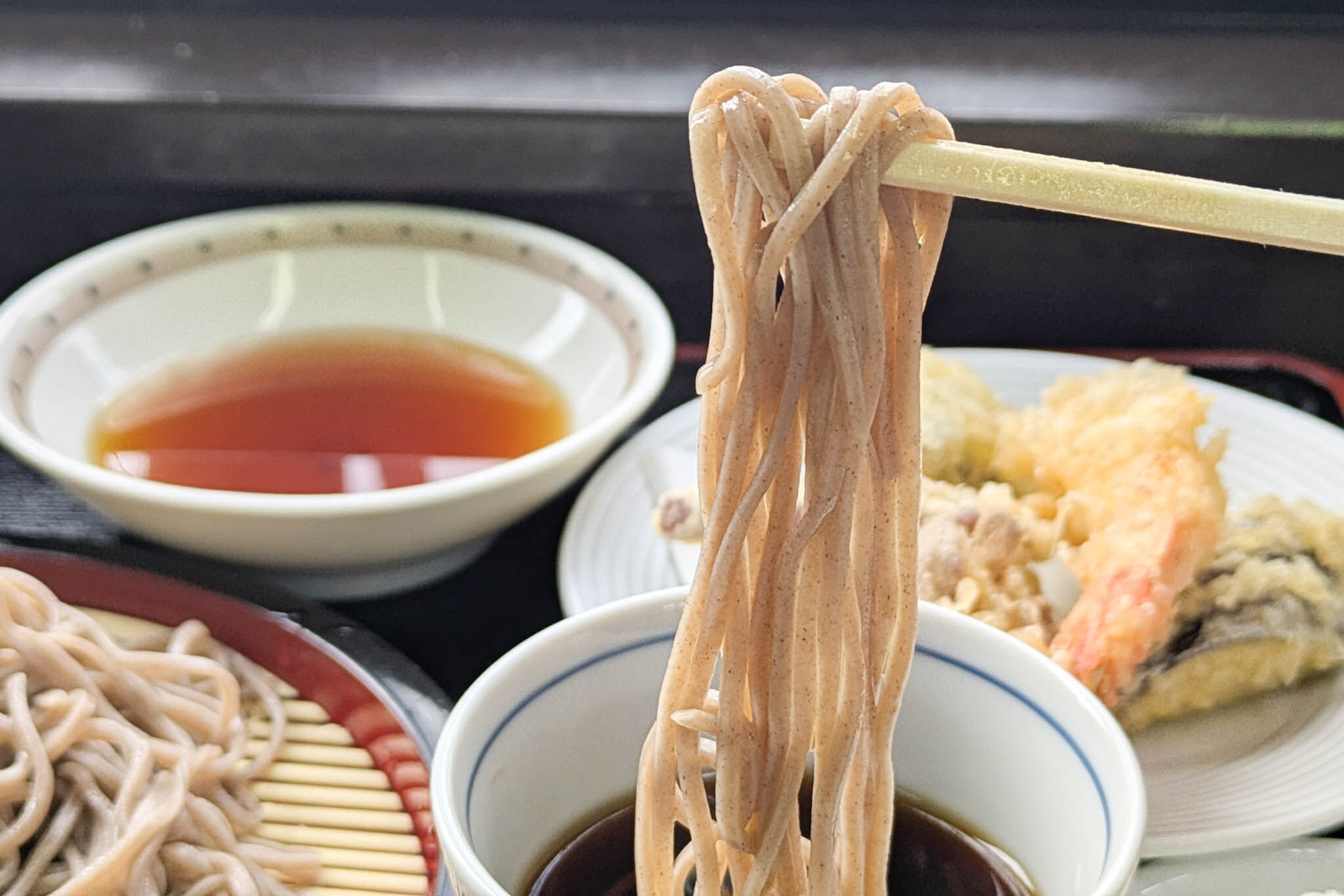 お出汁の香り、艷やかな蕎麦、揚げたてでボリュームのある天ぷら。見ているだけでも大満足のラインナップです。