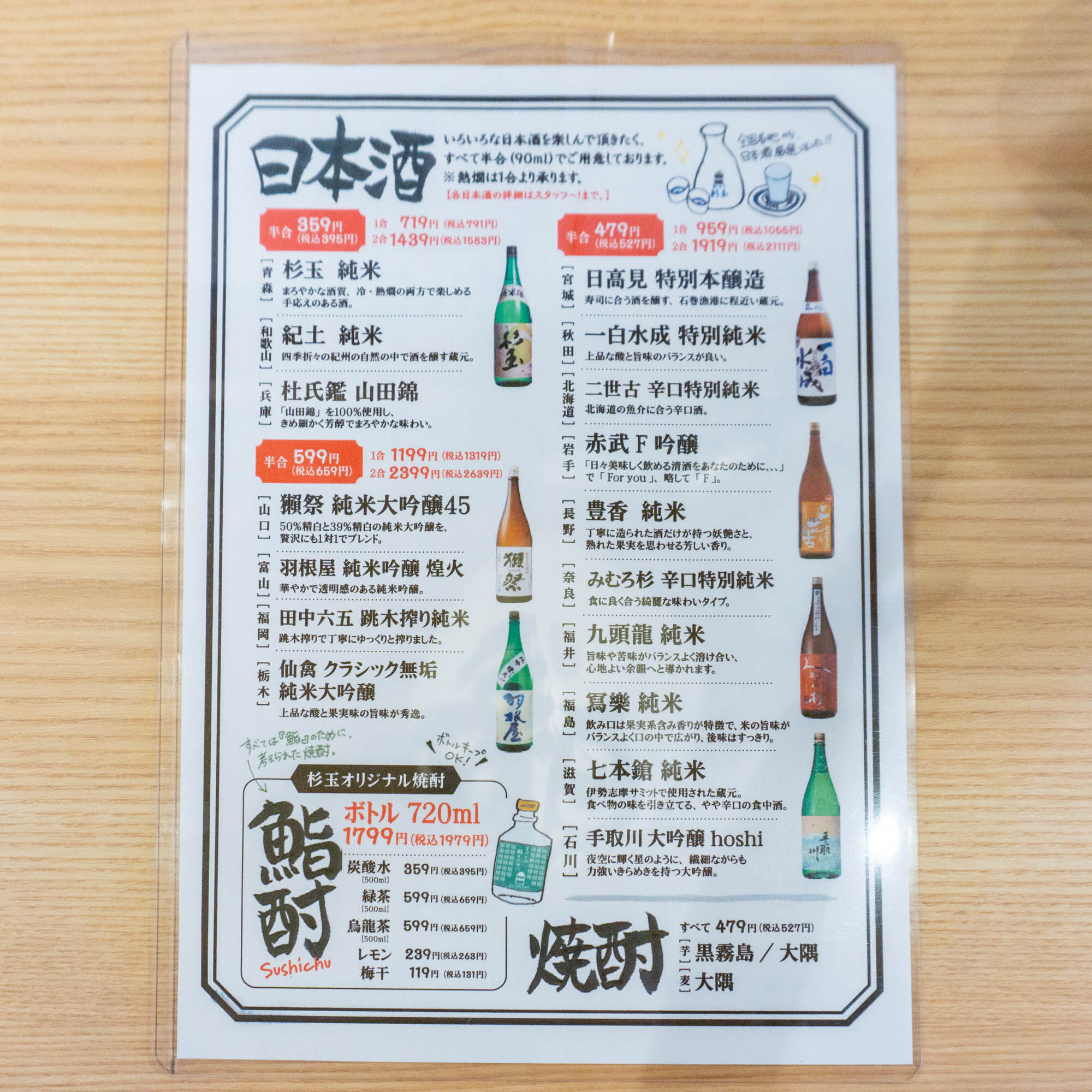 日本酒や焼酎メニュー。たくさんのメニューが置いてありました。昼飲みしたい人も満足できそう!