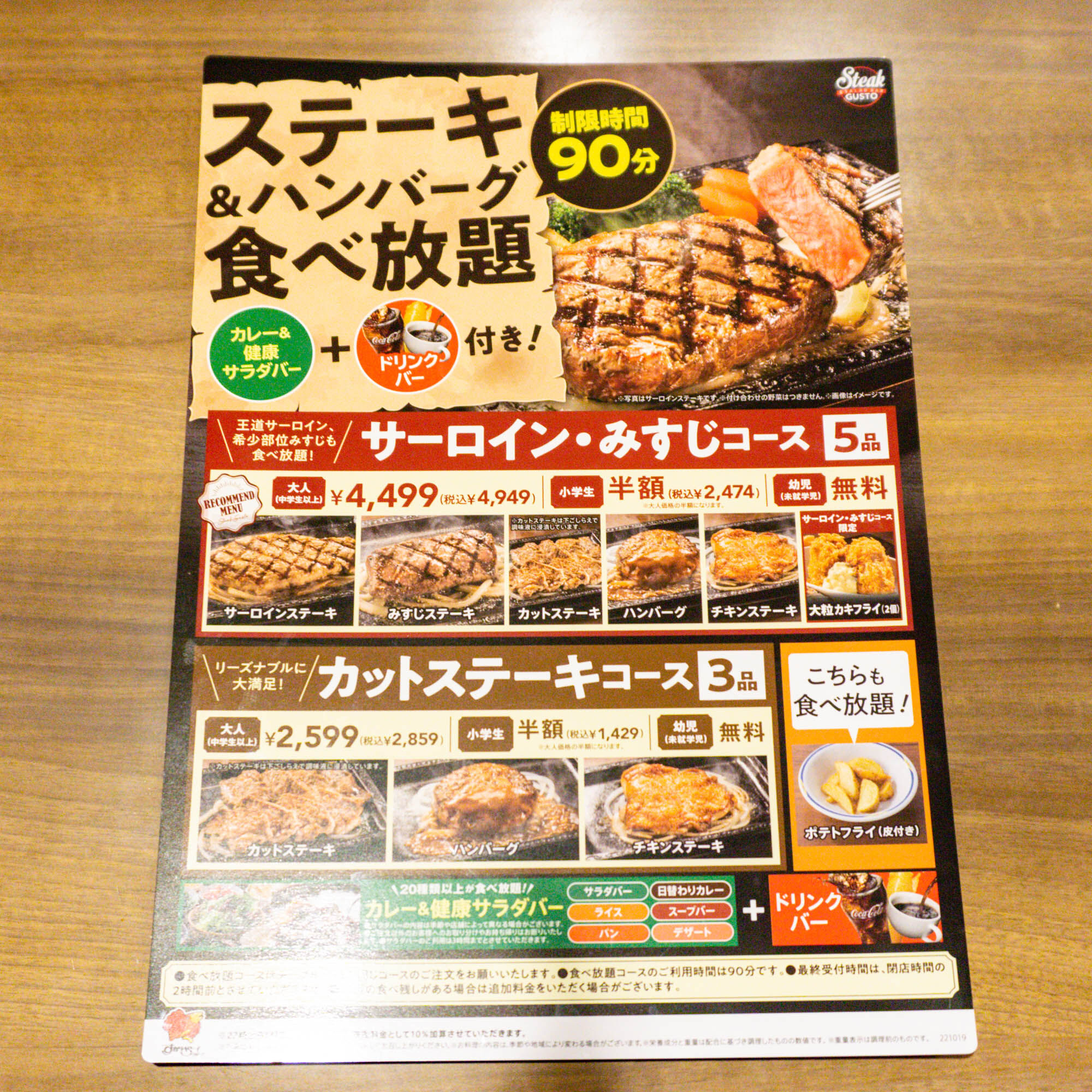 テーブルには食べ放題メニューが置いてありました。ステーキガストだし、ステーキを堪能したい!ということで、「サーロイン・みすじコース」を選択。「カレー&健康サラダバー」と「ドリンクバー」もついています。