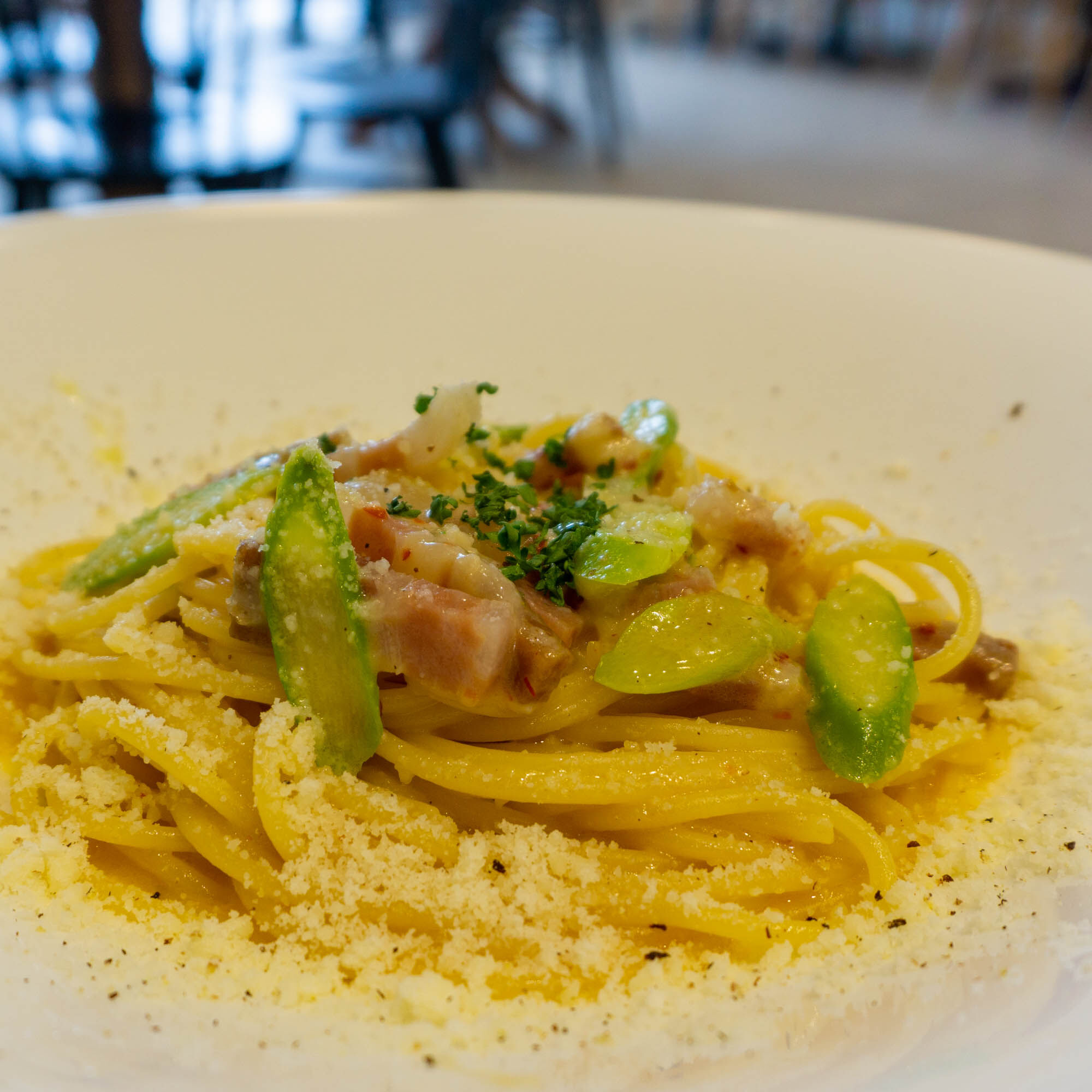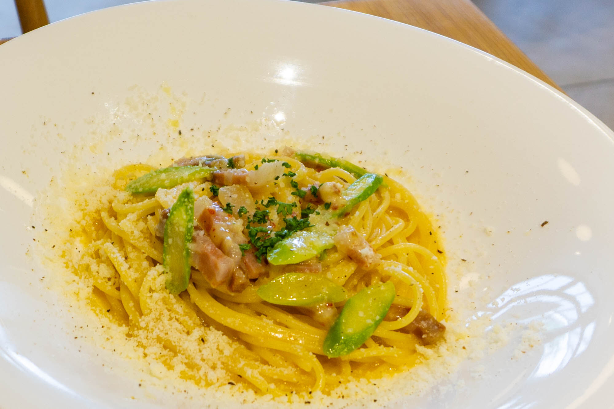 オイルとチーズが混ざり合っている&アスパラガスの軽さとパンチェッタの濃厚な旨味が最高〜!