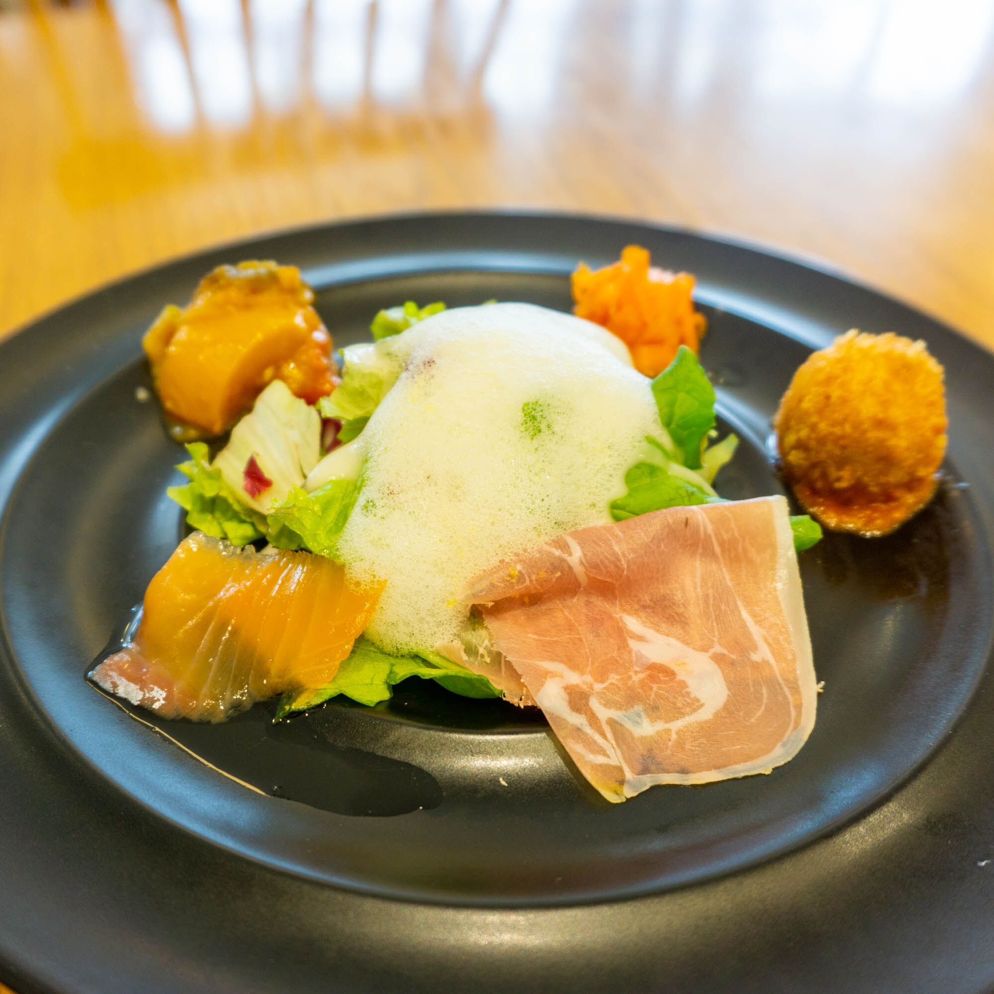 そしてグリーンサラダの上が泡泡してる!これはグレープフルーツの果汁から作ったものとのこと。食べてみると酸っぱい!