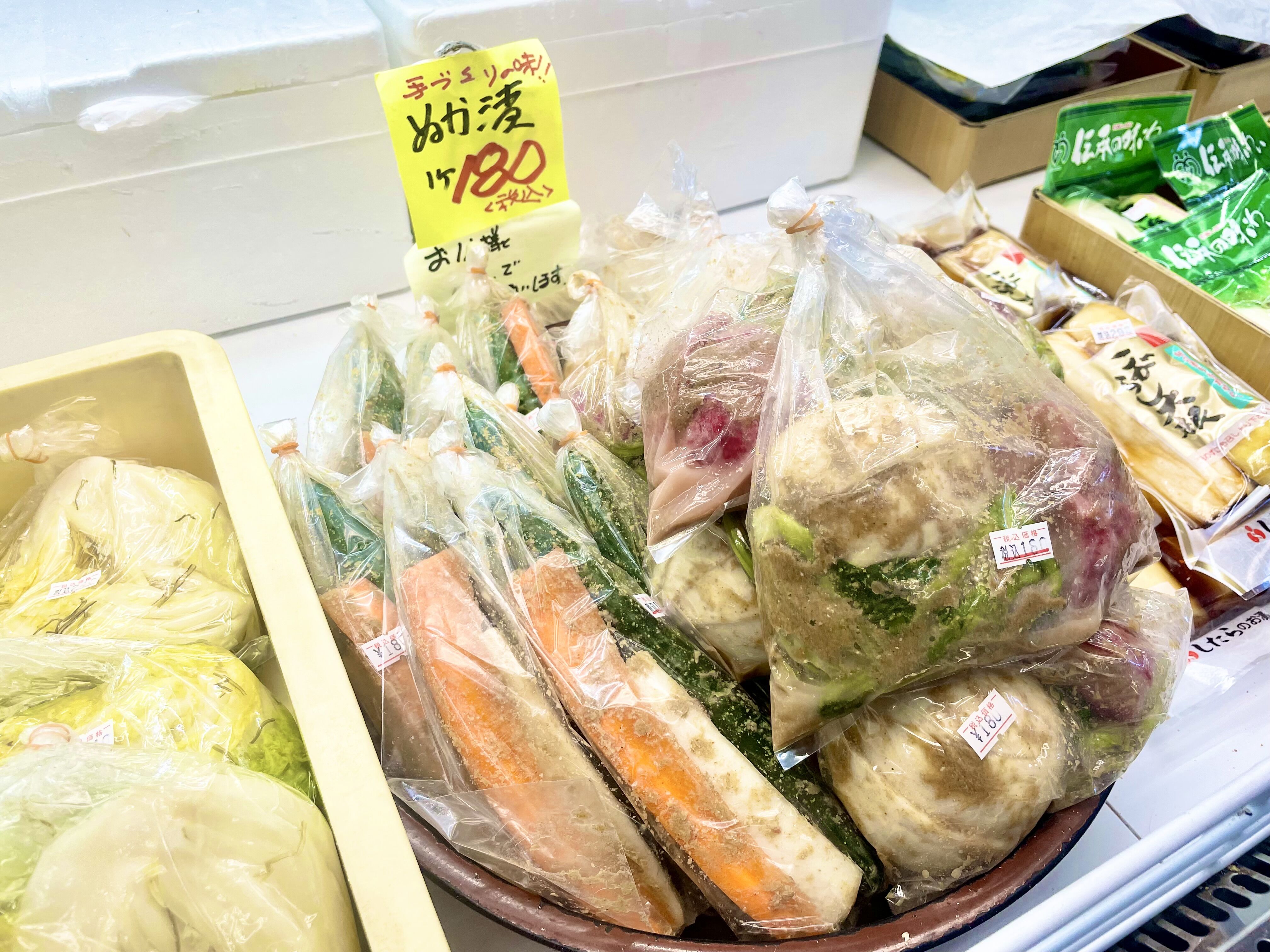 手作りの「ぬか漬」は人気商品のようで、「お1人様1つまで」というポップが貼ってありました。