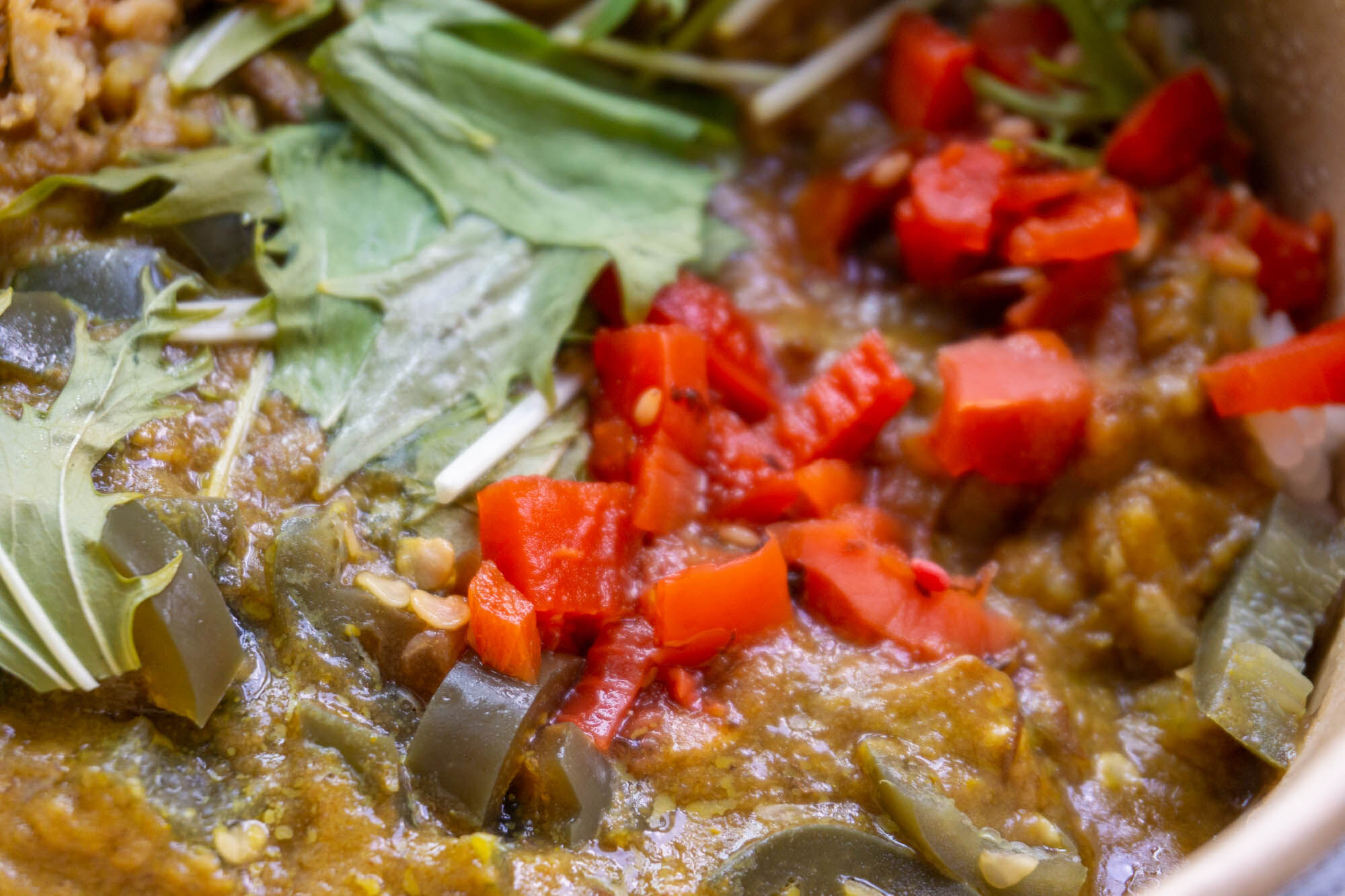 ルーはドロドロで具材が溶け込んでいて、真ん中に見えるピーマンのように見えるのはトッピングのハラペーニョ!