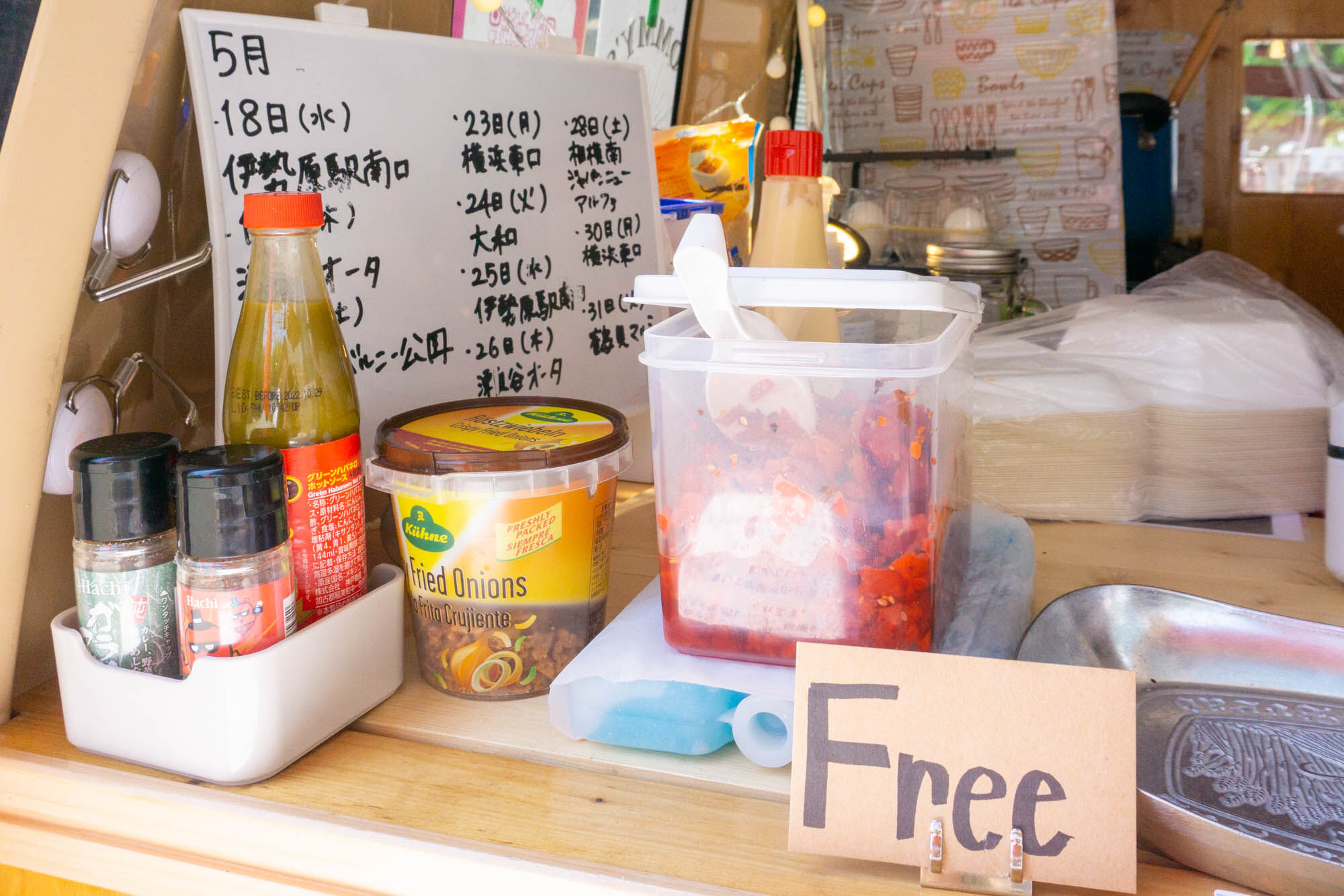 トッピングはセルフサービス。福神漬け・フライドオニオン・スパイスやチリソースなどもありました!