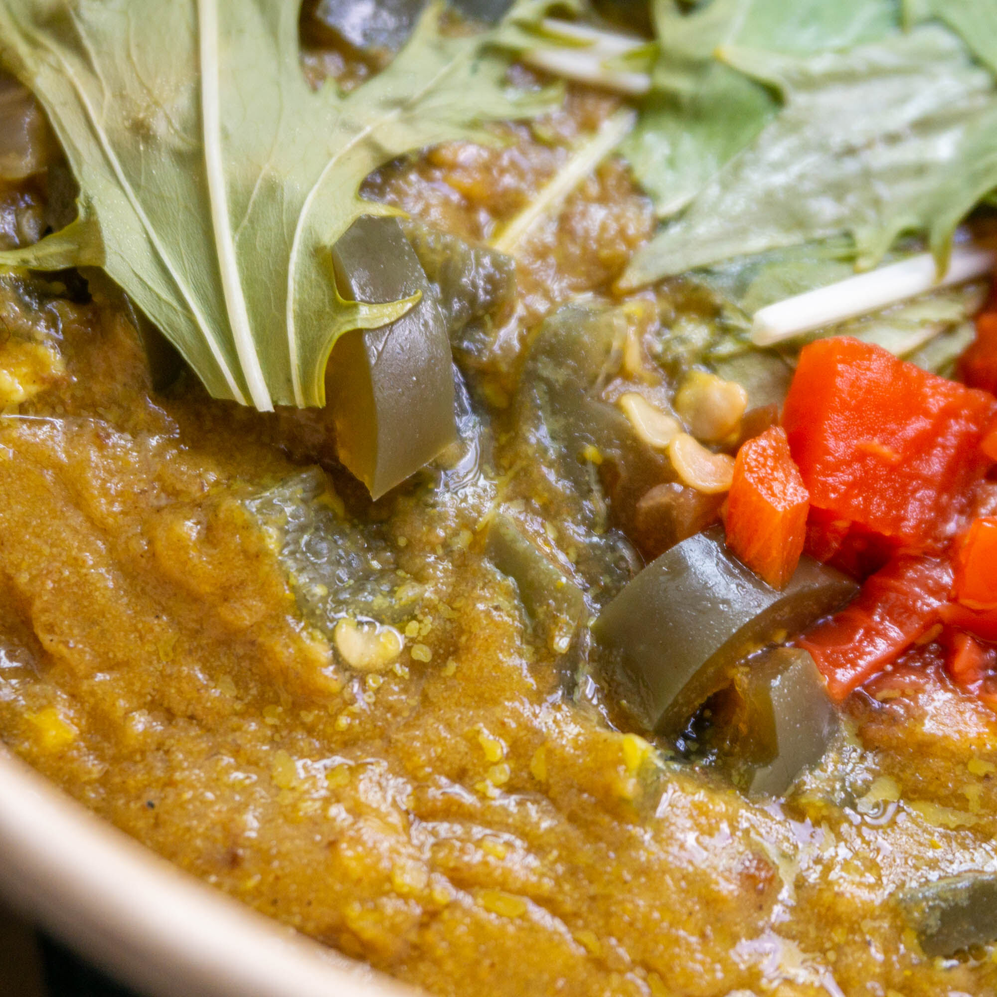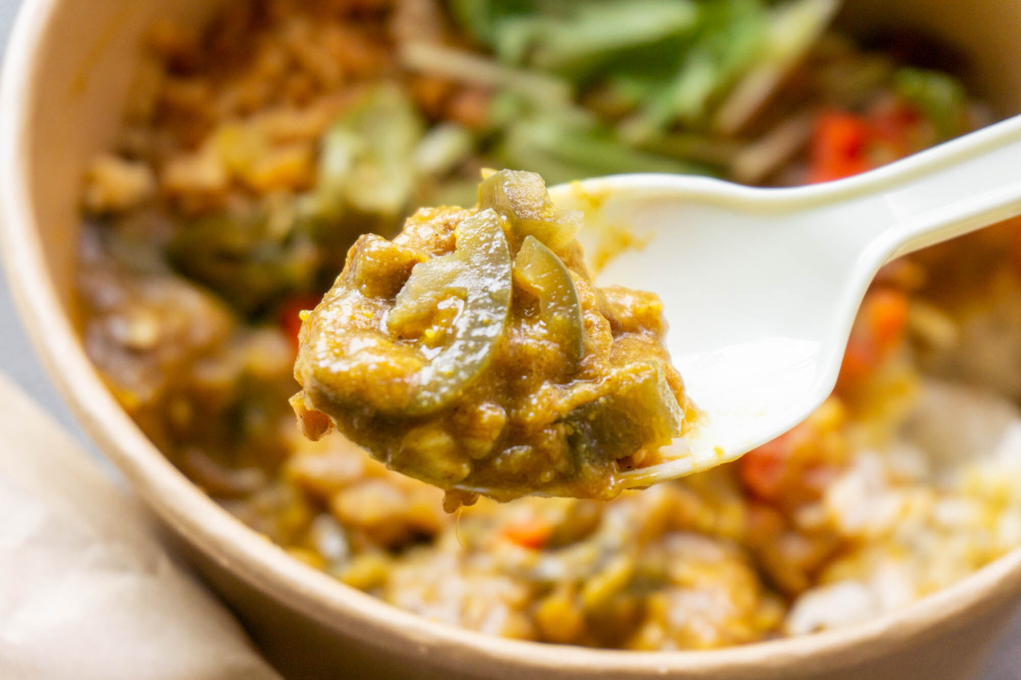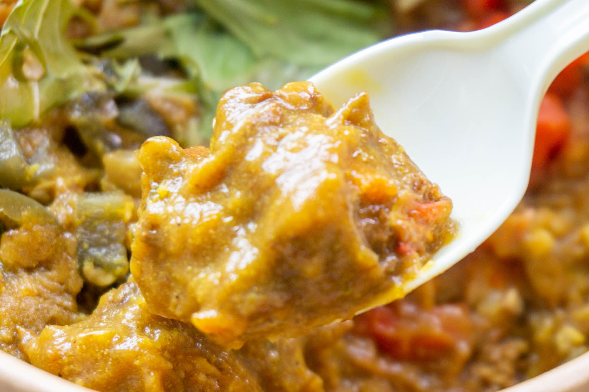 スプーンで持ってみるとこんな感じ。すこし人参が見えますね!かなり溶け込んでいて牛すじもしっかりと入っています。