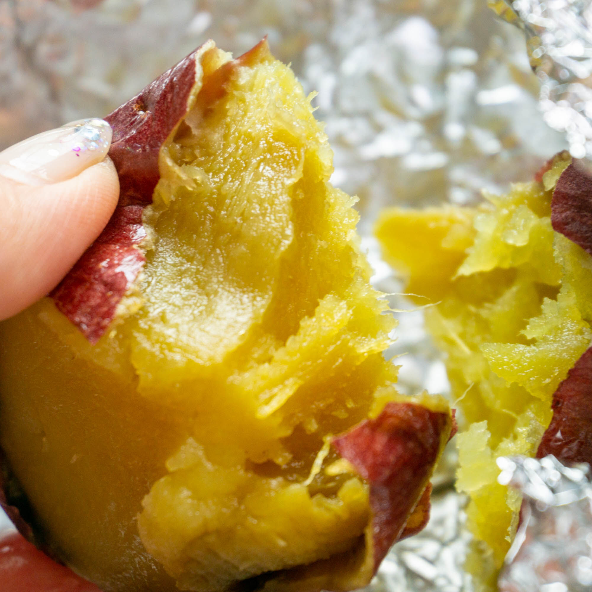 割るとこんな感じ。ねっとりとしていて、素手で持つとはちみつのような蜜が手にもめっちゃつきます!