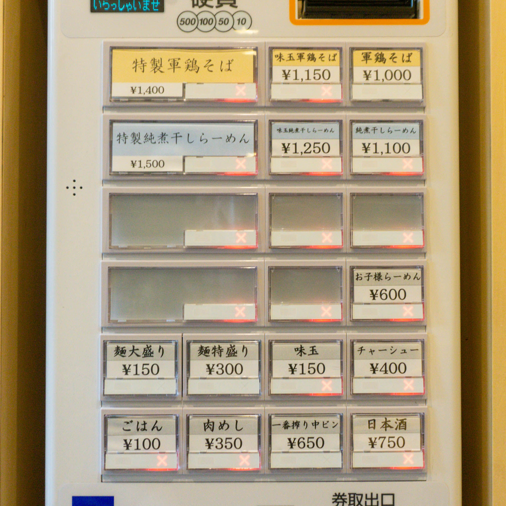 店内に入ると券売機が。プレオープンでは「軍鶏そば」のみの提供でした。