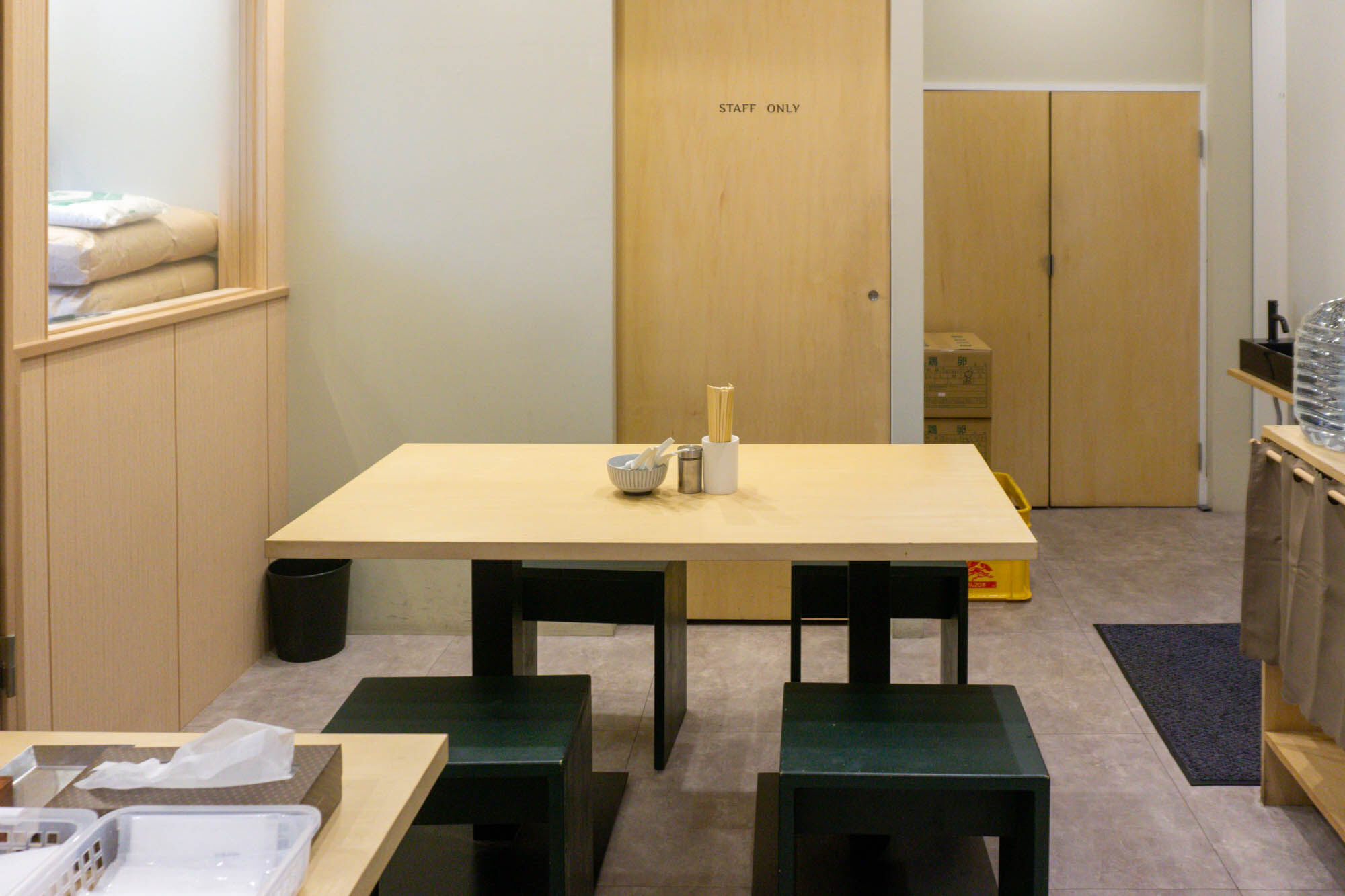 券売機横には、「セルフサービスのお冷・ティッシュ・紙エプロン・おしぼり・荷物入れ」などが置いてありました。