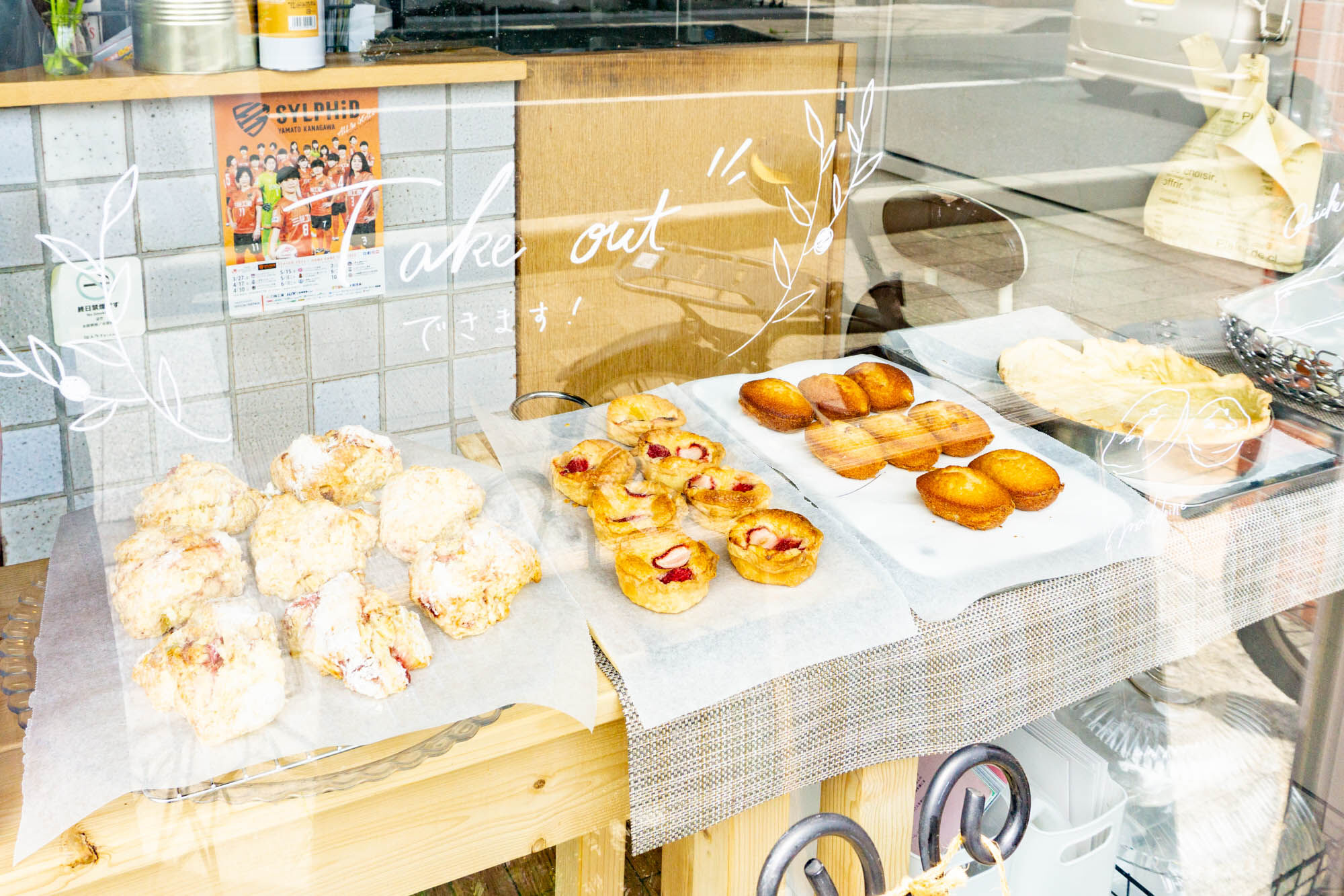 店舗外からチラッと覗くと焼き菓子が。「Take outできます!」とガラスに書いてありました。