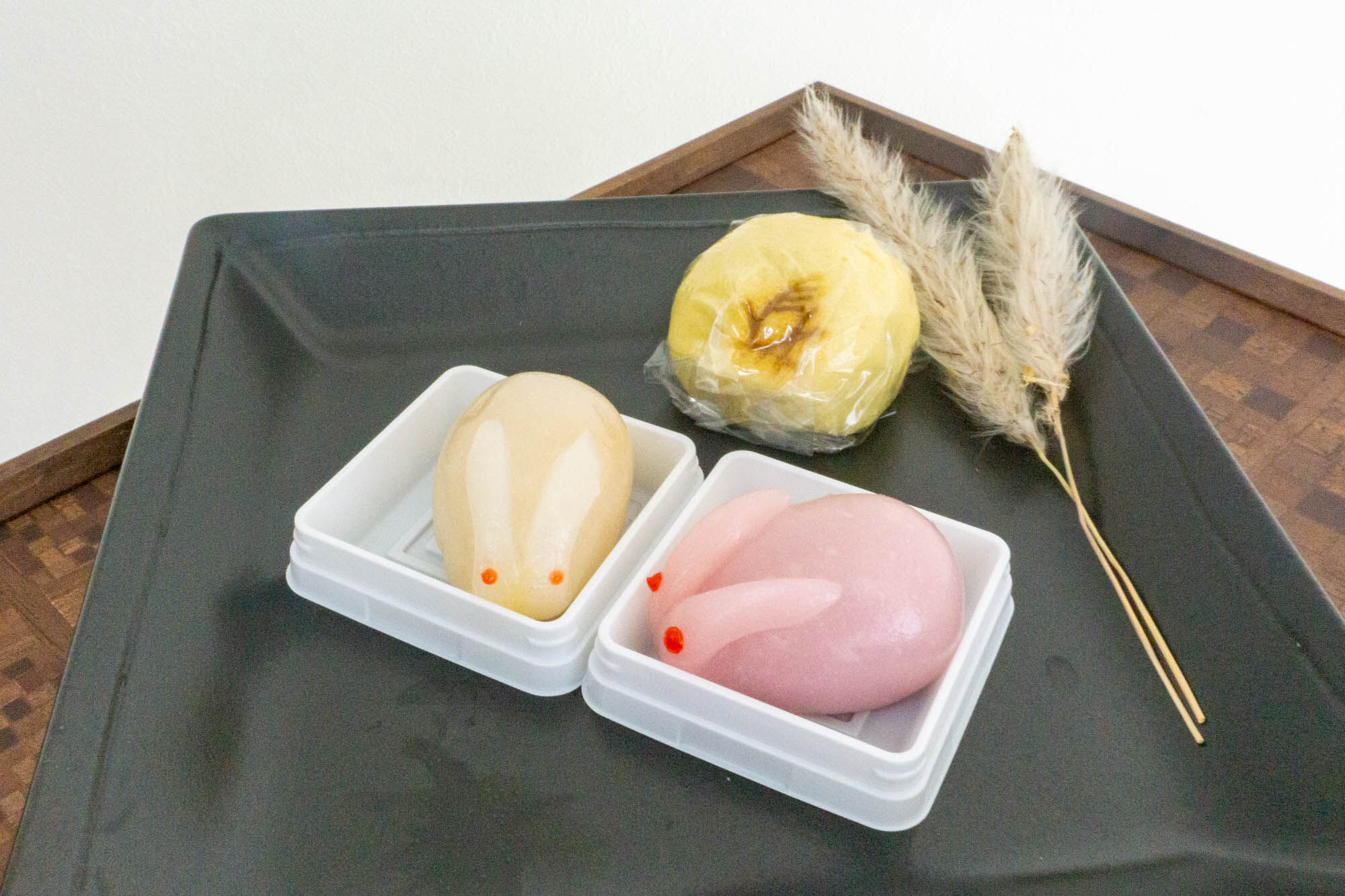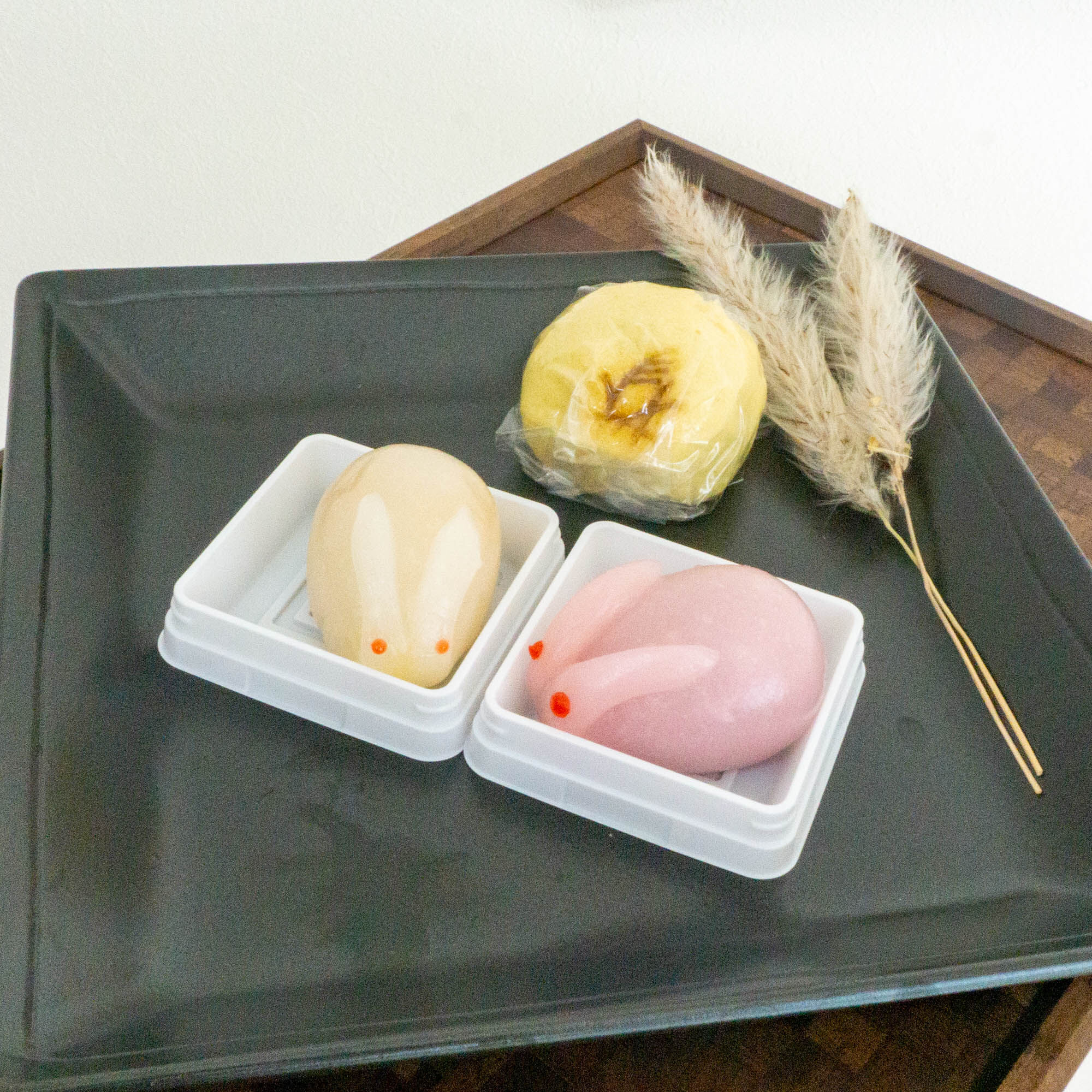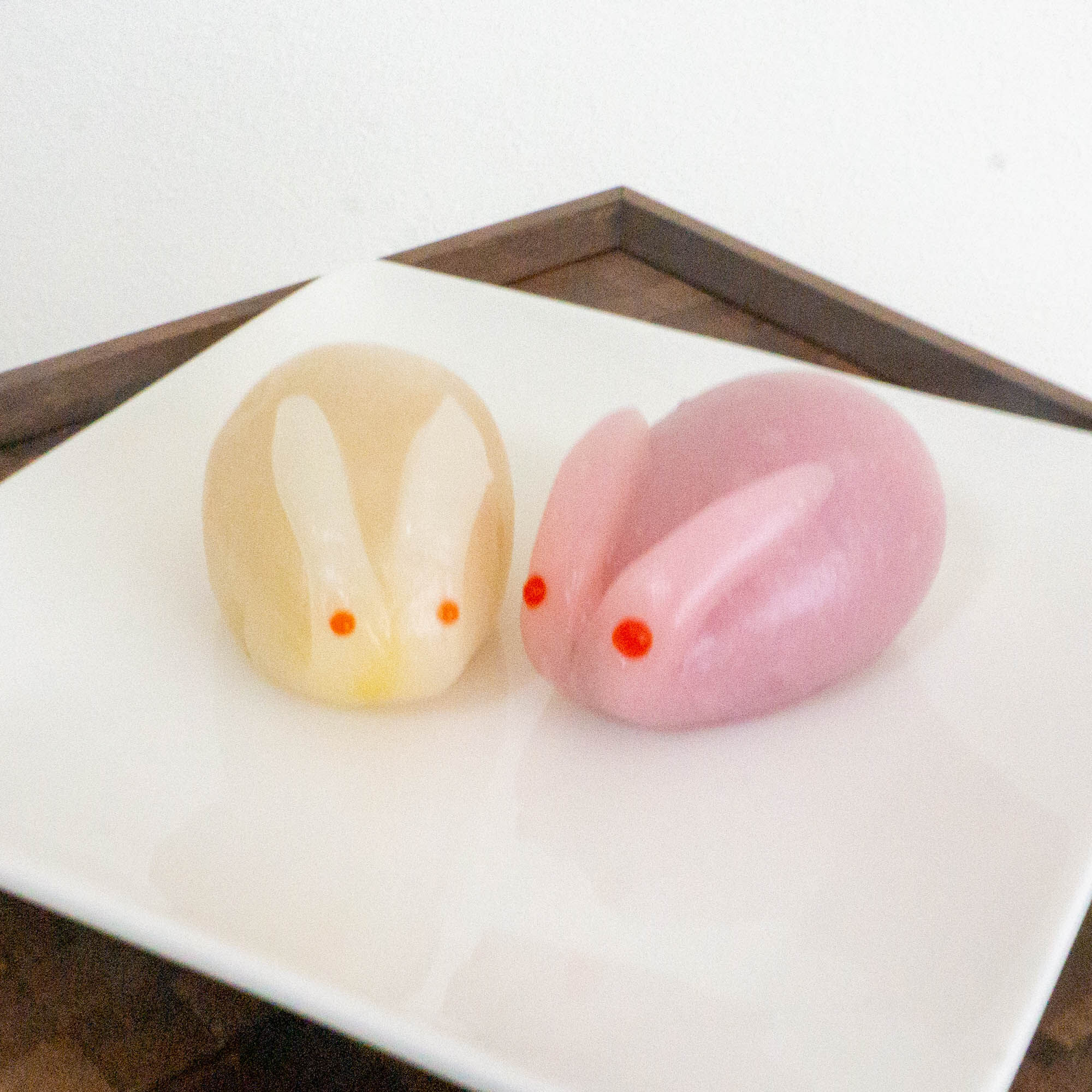 左のピンクうさぎ餅は中身はこしあん、右の白うさぎ餅はきみあんが入っていましたよ!きみあんは優しい甘みでほっくり感のあるお味。
