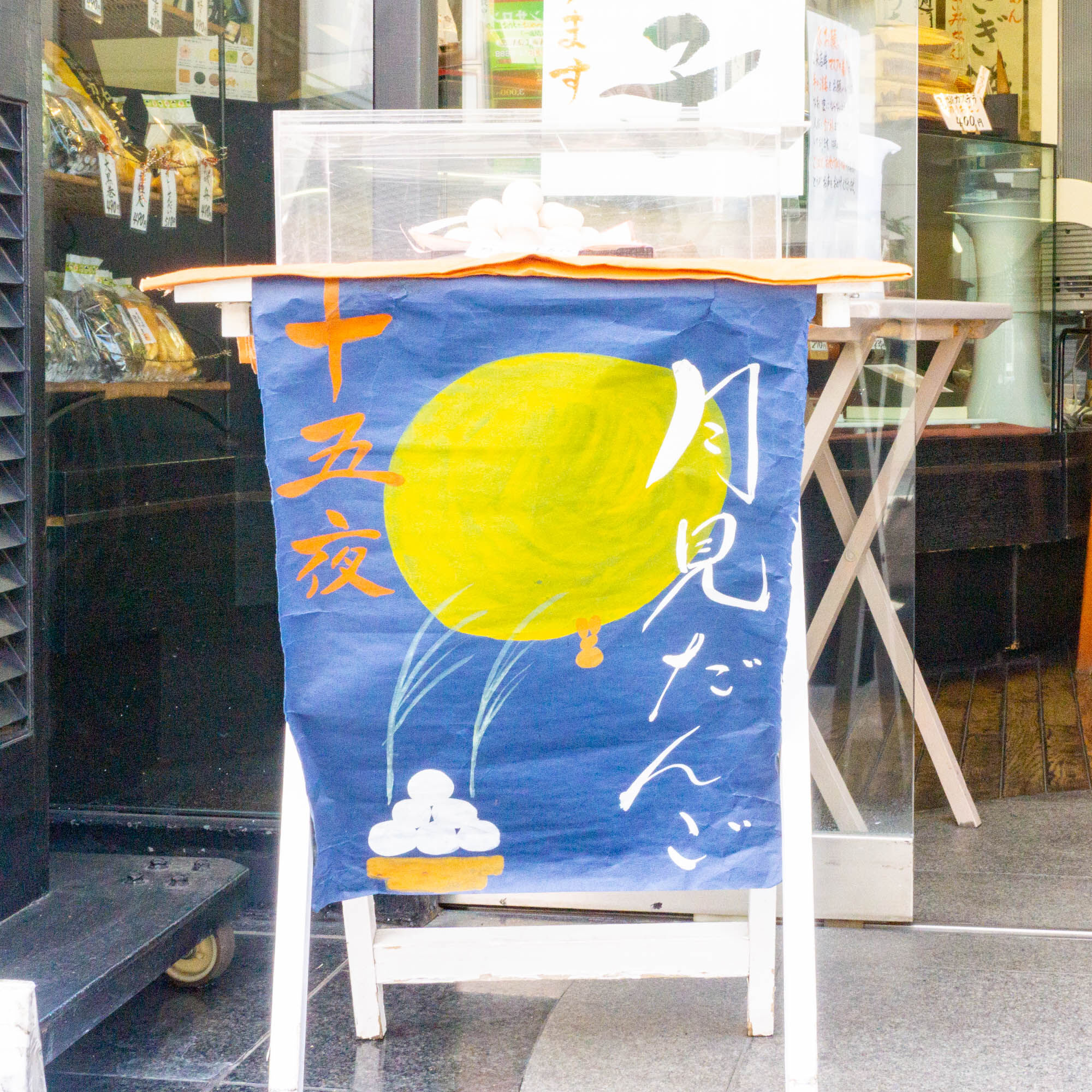 南林間駅からすぐの和菓子店「和空鉢の木」の店舗前にはこんな看板が。月見だんご〜!